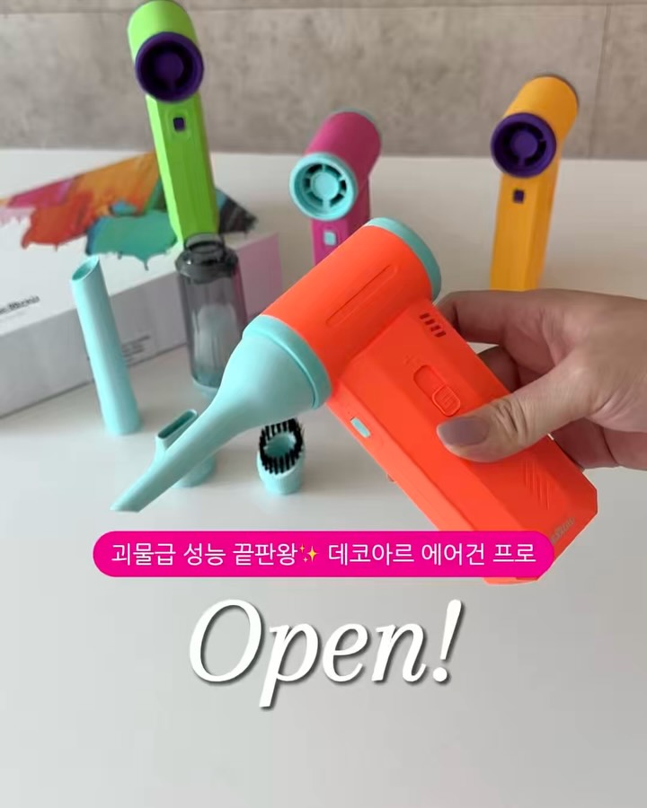 💨스펙+가성비 끝판왕! 데코아르 무선 에어건 최저가 공구 오픈🩷 작고 귀여운 디자인이지만 바람은 강풍급! 유명 제품들보다 스펙은 더 좋고 가격은 훨씬 착한 진짜 가성비 끝판왕🔥 🌪️ 강력한 흡입 + 초강풍 분출 뭐든 스치기만 해도 싹- 날려버리고, 싹- 빨아들이는 2in1 만능 에어건입니다🙌🏻 🧩 노즐 5종 기본 포함으로 에어건 하나만 있어도 ✔ 청소부터 ✔ 세차 ✔ 먼지털이 ✔ 드라이 ✔ 선풍기 ✔ 에어펌프 대용까지 활용도 진짜 미쳤어요!! 🔋무선이라 차량이든 집이든 어디서든 편하게 쓸 수 있고, 🎒 2만 원 상당 전용 파우치 증정 보관도 휴대도 깔끔하게! 📌 주요 스펙 ✔ 최대 풍속 : 22m/s ✔ 최대 풍압 : 170g ✔ 흡입력 : 8,000Pa ✔ 회전속도 : 130,000rpm ✔ 배터리 : 8,000mAh ✔ 사용시간 : 15~240분 ✔ 무게 : 단 277g ✔ 슬라이드 버튼으로 풍속 조절 가능 🎨 색상 민트 / 오렌지 / 그린 📦 구성품 노즐 5종 (납작 블로우 / 좁은 블로우 / 브러시 흡입 / 긴 흡입 / 먼지통) 👉🏻 필터, 충전케이블, 2만 원 상당 전용 파우치 ⚠️ 주의사항 ✔️드라이 용도로 사용 시 긴 머리카락의 경우 흡입구 주의 ✔️필터는 세척 후 완전히 건조 후 사용해 주세요! 💥 스펙+가성비 끝판왕! 데코아르 무선 에어건는 지금 바로 구매 가능하세요 💙 #데코아르에어건 #에어건 #에어펌프 #세차용품