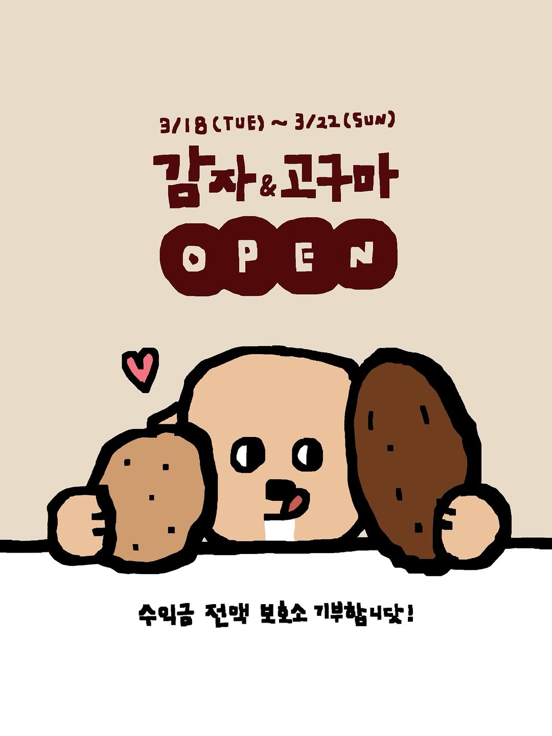 수미 감자 & 로얄벌꿀 고구마 공구 오픈합니다. 🥔🍠 늘 그래왔듯 수익금 전액은 보호소 강아지들을 위해 기부할 예정이에요. 포슬포슬하고 담백한 수미 감자, 달콤하고 촉촉한 로얄벌꿀 고구마. 집에서 맛있게 드시기에도 좋고, 강아지들 화식 토핑으로 활용하기에도 좋아요. 맛있는 먹거리도 챙기고 아이들에게 따뜻한 마음도 전해주세요-! 공구 기간은 3/18(화)~3/22(일)까지입니다. 늘 함께해주셔서 감사합니다. 🙌🤍