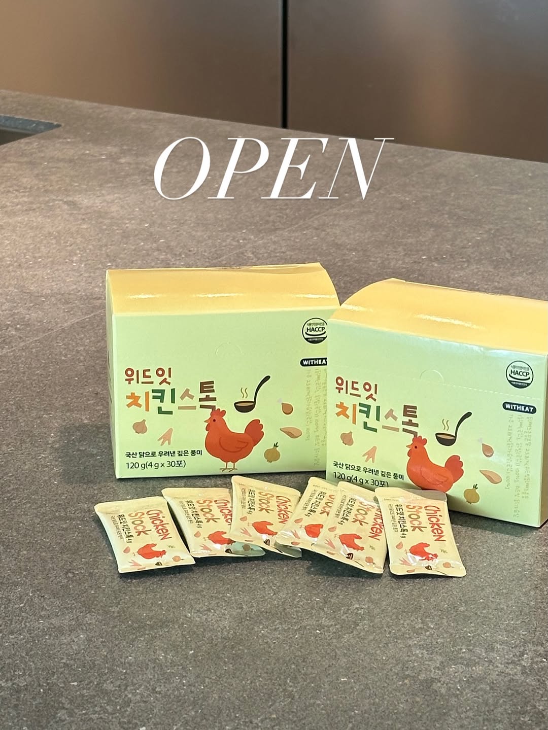 잠시후 10시 위드잇 치킨스톡 오픈! 아이부터 어른까지 안심하고 사용가능한 첨가물 0% 진짜 치킨스톡이에요 이미 엄마들 사이에 유명한 위드잇 치킨스톡은 첨가물 완전 제로 국산 무항생제 닭 닭발 국산 양파 마늘을 넣어 12시간 푹 고와낸 진짜 찐한 닭육수에요 볶음 무침 부침 국물요리 어떤 요리에 넣어도 감칠맛을 살려줍니다 볶음밥이나 스파게티 국물요리에 넣어보세요 음식이 정말 맛있어집니다! 액체가 아닌 가루형태로 1포씩 사용하기 편해요 가루가 정말 고와서 찬물에도 잘녹습니다! 1포만 넣어도 찐한 닭육수완성이에요 첫공구로 이벤트도 풍성하니 많이 참여해주세요! 🎁선착순 이벤트 20명 쯔유스톡 증정 🎁구매인증 이벤트 20명 김자반 1박스 증정 (뒷번호4자리) (후기필수) ✔️국산 무항생제 닭 47.62% ✔️국산 양파 마늘이 들어간 건강한 치킨스톡 ✔️화학첨가물 완전 제로 ✔️향신료, 나트룸, 팜유, 대두유 첨가물 제로 ✔️찬물에도 잘 녹는 12시간 우린 진짜 닭육수 ✔️유아식부터 일반식까지 어떤 요리든 가능 ✔️해썹 인증 시설