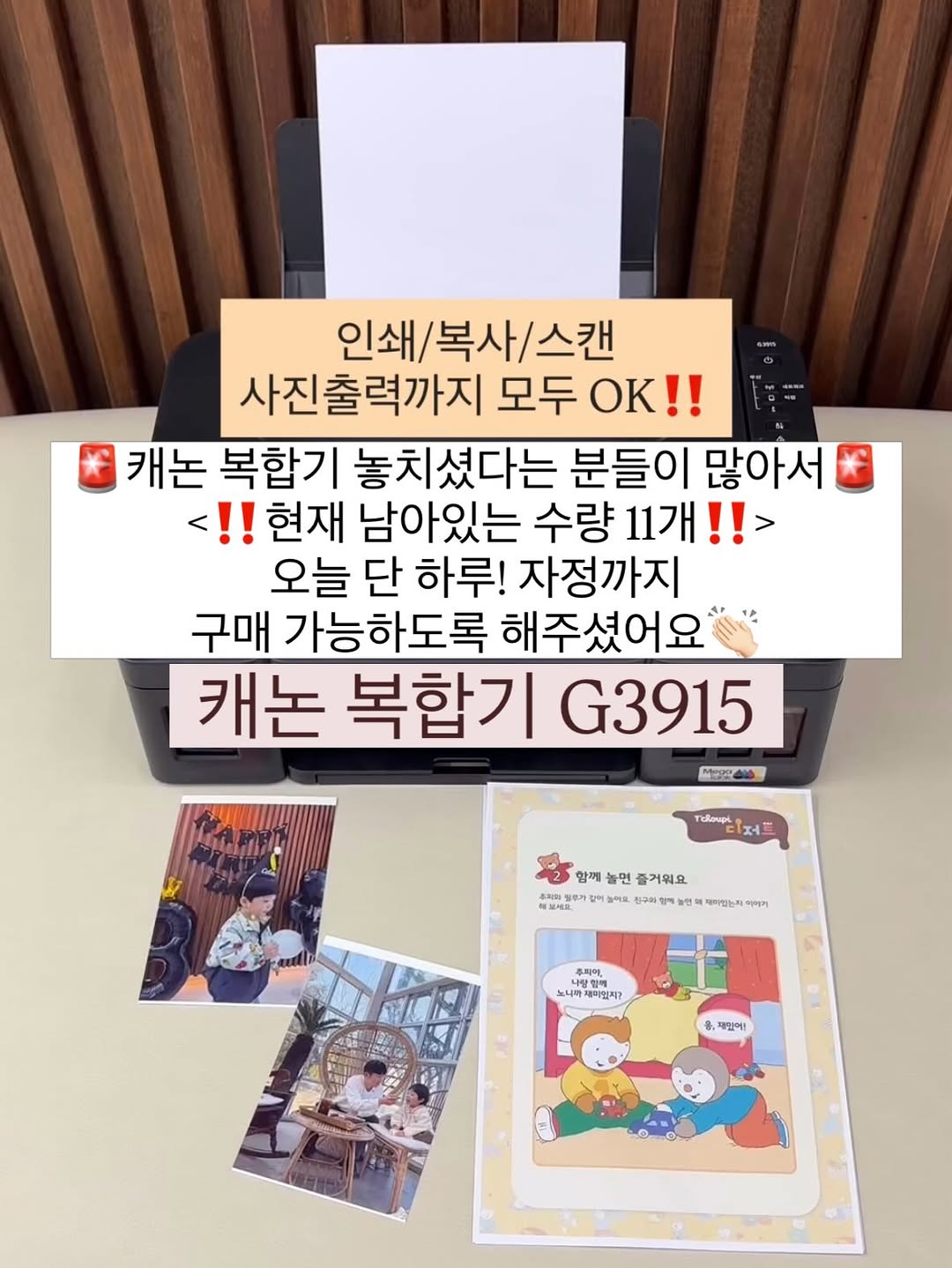 SOLD OUT! 마지막 재고 전부 판매완료 되었습니다‼️🙏😂😂 🚨캐논 프린터기 놓치셨다는 분들이 많아서 <‼️현재 남아있는 수량 11개‼️> 오늘 단 하루! 자정까지 구매 가능하도록 해주셨어요👏🏻 프로필 링크내에서 구매 가능하세요-🥹 🎁구매완료 이벤트🎁 오픈피드에 구매완료 + 휴대폰뒤 4자리 남겨주시면 추첨 통해 5분께 네이버페이 5,000원 지급!🥰 (당첨자는 공구종료 후 2주 뒤 해당 게시물 고정 댓글 발표) ㅡㅡㅡㅡㅡㅡㅡ #캐논복합기#공구 캐논 복합기 프린터 PIXMA G3915 ‼️캐논 PP208 고광택 포토 용지 100매 전원증정‼️ ✔️ 구성 👉 프린터 본체 👉 잉크 기본 포함 👉 포토용지 100매 증정 ✔️ 배송 / AS 🚚 무료배송 ✔️ 품질보증 1년 ✔️ 캐논 공식 AS 가능 (전국 80여개 센터) ※ 교환 / 반품은 👉 잉크 장착 전 + 구성품 모두 있을 때 가능 “프린터 괜히 자리만 많이 차지하고 진짜 필요할까?” 했던 시절이 있었는데 지금은 없으면 안 되는 육아템 이에요🙂 어린이집 식단표, 일정표도 매번 사진첩이나 키즈노트 들어가서 확인하기 번거롭고, 깜빡하고 확인 못한 날도 많았는데 이제 출력해서 잘 보이는 곳에 붙여놓으면 ok!! 나짱구 육아정보 뿐만 아니라 요즘 무료 자료 나눔, 도안 정말 많은데 프린터 있으면 바로 출력해서 수시로 볼 수 있어서 정말 좋아요🙂 또 전용 포토용지 넣으면 아이 사진 집에서 맘껏 인화할 수도 있어요 사진 진짜 고퀄이에요👍 캐논 프린터는 직접 내돈내산으로 여러 제품 비교해서 캐논 G3915 제품을 👉 20만원대에 구매했었거든요😭 근데 이번 공구에서는 👉 17만원대로 진행합니다!!👍 이건 놓치지 말아야해🥹 이 제품 👉 2년째 고장 없이 사용 중이에요 ‼️AS / CS 걱정 안 하셔도 돼요 👉 캐논 본사 동일하게 진행됩니다‼️ ✔️ 다른 모델도 고민했었어요 신상이나 상위 모델도 있었는데 기능 몇 개 더 추가됐다고 👉 가격이 30만원 훌쩍 넘어가더라구요 솔직히 그 기능까지 자주 쓸까 싶고 하위 모델은 사진인화를 할수 없고 (G3910 등 이하모델) 인쇄물 퀄리티가 낮아 패스!! 그래서 저는 가성비로 이 모델 선택했어요🙂 📌 프린터 고를 때 중요하게 본 기준! 1️⃣ 대용량 잉크 👉 예전엔 잉크값이 프린터보다 더 나왔던 기억…😇 👉 최대 7000매 까지 출력가능 2️⃣ 잉크 교체 쉬울 것 👉 손 안 묻고 그냥 부으면 끝 👉 몇 년은 교체 걱정 거의 없음 3️⃣ 기능 (복합기 필수) 👉 컬러 / 흑백 출력 👉 스캔 / 복사 👉 사진 출력까지 다 가능 4️⃣ 부피 & 디자인 👉 잉크통 외부형은 자리 많이 차지하는데 👉 이건 내부형이라 깔끔하고 컴팩트 5️⃣ 인쇄 퀄리티 👉 가격만 보고 퀄리티 떨어지는 건 ❌ 👉 선명하게 출력 잘 됩니다 6️⃣ 컴퓨터 없이도 핸드폰으로 바로 출력 가능 👉’ 캐논 프린트 앱’ 다운로드 후 출력 가능해요 📌 복사, 스캔, 사진인화. 핸드폰출력 까지 다 되는 복합기! 이 정도 기능이면 가격대 다들 아시잖아요…? 👉 요즘은 10만원대로는 진짜 찾기 힘들어요 솔직히 육아템은 👉 “있으면 좋은 것”보다 👉 없으면 불편한 게 더 중요하더라구요 프린터는 진짜… 👉 쓰면 ‘진작에 살걸’ 싶으실 거예요🙂 저도 지금은 없으면 안 되는 육아템 이랍니다🙂 👉 @나짱구 팔로우하고 육아 꿀팁&꿀템 놓치지 마세요🤗 좋아요/저장/공유는 컨텐츠 제작에 큰 힘이 됩니다😄 ㆍ ㆍ #프린터#프린터기#육아템