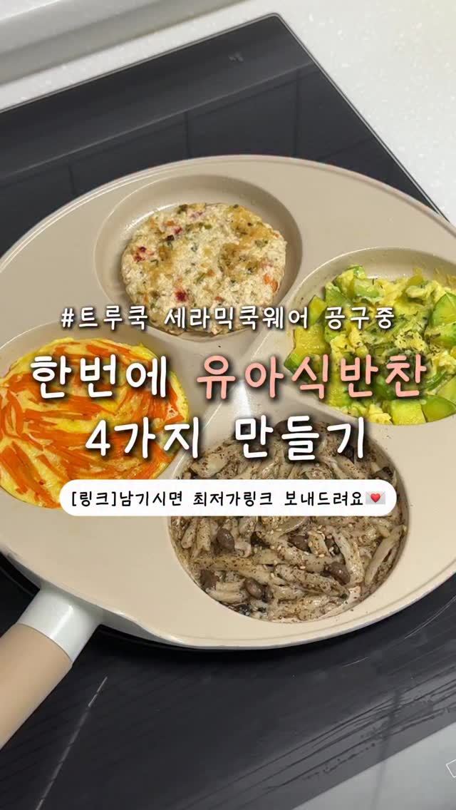 #공구중 [링크]남겨주시면 최저가링크 보내드려요! 우리아이들 먹는 양도 적고, 간이 덜 되어있다보니 쉽게 상해 소량씩 자주 요리해야해서 매번 번거로우셨죠? 이것저것 만들다보면 설거지거리도 한가득…! 요리하고 치우고를 반복하다보면 하루가 다 가버리죠😭 이런 어려움을 손쉽게 해결해줄 [트루쿡 4구 에그팬] 한번에 4가지 반찬을 요리할 수 있어서 시간도 단축되고 에그팬 하나만 설거지하면 끝, 뒷정리도 간단해요! 4구 에그팬을 활용한 유아식반찬 레시피 공유해요! 재료도 조리과정도 간단하니까 꼭 한번 만들어보세요♥️ ——————————————— 📣 레시피에 사용한 쿡웨어 [트루쿡]은 현재 공구중인 제품으로 프로필(@ddohuni_mom)링크에서 21일(화)까지 구매가능해요! 구매완료이벤트 진행중으로 오픈피드 꼭 확인부탁드려요🙇🏻♀️ ——————————————— 👶🏻 당근계란전 [재료] 당근 1/8개, 계란 1개 [레시피] 1️⃣ 당근을 얇게 채썰어서 준비해주세요 2️⃣ 에그팬에 기름을 두르고 당근을 볶아주세요 3️⃣ 당근이 어느정도 익으면 계란을 풀어 넣어주세요 4️⃣ 앞뒤로 골고루 익혀주면 완성! 👶🏻 두부스테이크 [재료] 두부 1/4모, 야채후레이크&전분가루 1티스푼씩 [레시피] 1️⃣ 두부의 물기를 먼저 제거해주세요 2️⃣ 두부, 야채후레이크, 전분가루를 넣고 골고루 섞어주세요 3️⃣ 에그팬에 기름을 두르고 노릇노릇 구워주면 완성! 👶🏻 애호박버터볶음 [재료] 애호박 1/6개, 계란 1개, 무염버터 약 7-8g [래시피] 1️⃣ 무염버터를 넣고 애호밖을 볶아주세요 2️⃣ 계란을 풀어 넣고 스크램블해주면 완성! 👶🏻 버섯들깨볶음 [재료] 느타리버섯 한줌, 아기간장 1티스푼, 들깨가루 1티스푼, 참기름 1티스푼, 다진마늘 조금 [레시피] 1️⃣ 기름을 두르고 다진마늘과 버섯을 볶아주세요 2️⃣ 버섯이 익으면 아기간장, 들깨가루를 넣어 간해주세요 3️⃣ 참기름을 넣고 섞어주면 완성! ▪️계란물, 두부반죽에 소금을 조금 넣어 간을 해주셔도 괜찮아요 ▪️계란 1개로 당근계란전과 애호박버터볶음에 나눠 사용했어요 ▪️느타리버섯 말고 다른 버섯으로 대체 가능해요 🏷️ 레시피 정보 #또후니맘_레시피 에서 모아 볼 수 있어요💌 🏷️ 레시피 사용 후 태그 부탁드려요🙇🏻♀️ 🏷️ 쉽고 맛있는 유아식 @ddohuni_mom 과 함께해요:) #트루쿡 #트루쿡공구 #유아식반찬레시피