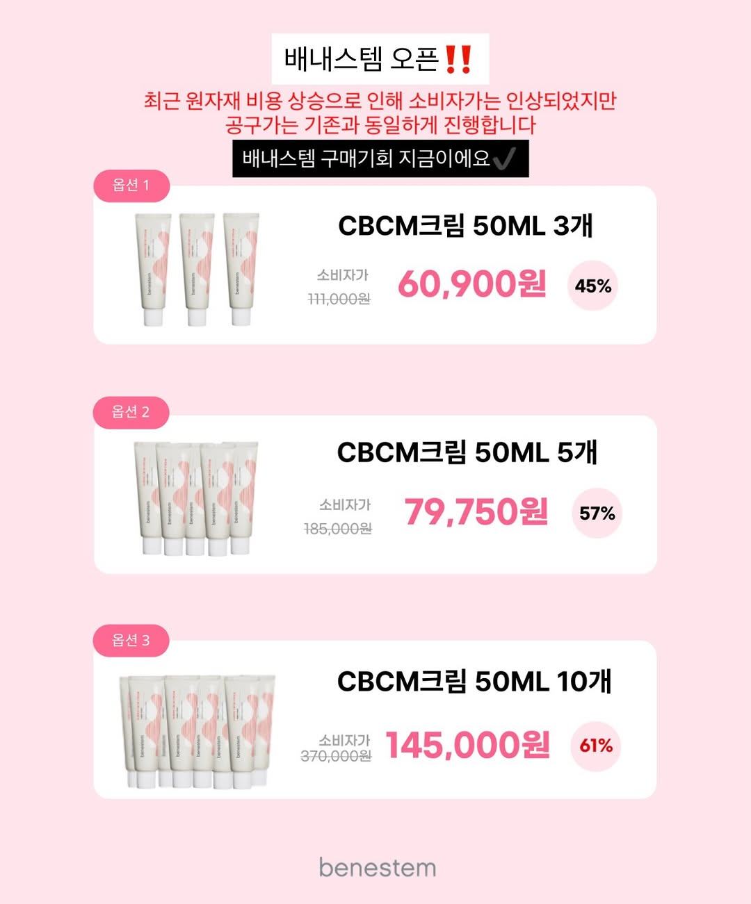 배내스템 오픈했어요‼️ 📌 선착순 20명 배내스템 크림 50ml 10개 옵션 구매 시 50ml 추가증정 📌 선착순 20명 배내스템 크림 150ml 4개 옵션 구매 시 50ml 추가증정 📌 선착순 10명 배내스템 선블록 40ml 5개 옵션 구매 시 선블록 추가증정 ⠀ ⚠️ 최근 원자재 비용 상승으로 인해 소비자가는 인상되었지만 공구가는 기존과 동일하게 진행합니다 배내스템 구매기회 지금이에요✔️오늘부터 딱 3일간 진행할게요✔️ ⠀ ⠀ 속보습개선⭕️ 피부장벽개선⭕️ 100시간 보장크림⭕️ 배내스템 휴먼 씨비씨엠 크림 ⠀ ▪️추천합니다 ▫️무엇을 발라도 자꾸만 마르는 건조한 피부를 가진 분 ▫️각질로 인해 푸석푸석한 피부가 고민인 분 ▫️피부 건조함으로 가려움을 경험하시는 분 ▫️온 가족이 함께 바를 수 있는 보습크림을 찾는 분 ▫️탄력과 생기를 잃은 허약 피부를 가진 분 ✅ 특허받은 피부 구조 구현 기술 적용 ✅ 피부 장벽 / 진정 효과 ✅ 제대혈 줄기세포 배양액 엑소좀 > 강력한 피부 생명력 ✅ 종합병원과 공동 연구 및 26가지 인체 적용 시험 완료 ✅ 무겁지 않은 쫀쫀한 크림 제형 ⠀ ⠀ 민감한 피부를 위한 수분 에센스 선케어🔅 배내스템 선블록 트루 워터리💧 ⠀ ▪️추천합니다 ▫️저자극 자외선 차단제를 찾는 분 ▫️자외선으로부터 건조해지는 피부가 염려되는 분 ▫️끈적임, 백탁없이 산뜻하게 바를 수 있는 선제품을 찾는 분 ▫️높은 자외선 차단지수로 강력한 자외선 차단을 원하는 분 ✅ 임상으로 확인! 안심하고 사용하는 자외선 차단 효과 ✅ 수분 에센스처럼 얇고 가벼운 촉촉한 발림성 / 백탁 ❌ ✅ 피부진정성분+건강케어성분> 자외선으로부터 자극받은 피부케어 ✅ 민감한 피부도 안심하는 저자극 선크림 ✅ 피부자극 테스트 완료 / EWG GREEN 등급 ⠀ ⠀ 평일 오전 9시 이전 주문 건 당일 출고됩니다 구경 오세요😊 ⠀ ⠀ #배내스템 #배내스템크림 #배내스템선블록 #배내스템공구