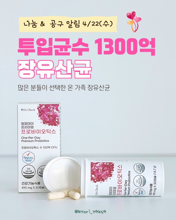 ✅ 투입균수 1300억 장유산균 나눔 & 공구 알림 #공동구매 여러분~ 제가 유산균에 진심인거 다들 아시죠~?🤓 저는 여러 제품을 늘 몸소 테스트 해보고 있는데요, 이건 정말 좋더라구요👍🏻 투입균수 1300억에 다니스코사 특허균주 HOWARU가 100% 들어 있는 유산균이랍니다! 제가 늘 강조했던 ⭕️비피도박테리움 + 락토바실러스⭕️ 조합! 이런 스펙은 못보셨을거에요👏🏻 많은 분들께서 재공구 원하셔서 4/22(수)일에 열어드릴 예정이랍니다^^ 제가 추천드렸던 유산균 잘 맞으셨던 분들은 잘 맞으실거에요☺️ 특히 저 처럼 여행가거나 생리 전에 화장실 못가는 분들, 가스 냄새가 특히 지독한분들, 평소에도 늘 화장실 못가는 분들, 조금만 잘못 먹으면 배 꾸륵거리는 분들, 유산균 아직도 정착 못하신 분들께 도움 될 수 있어요 :) ✅ 공구 가격 ( 1박스 = 30캡슐 ) 🔸 3박스 : 135,000원 ➡️ 81,000원 ( 40% 할인 ) 🔸 6박스 : 270,000원 ➡️ 147,000원 ( 45% 할인 ) 🔸 12박스 : 540,000원 ➡️ 278,400원 ( 48% 할인 ) ️❤️ 공구 알림 원하시는 분들은 달아주시면 공구 오픈날 대댓글 달아서 알려드릴게요 :) 🎁 공구 알림 댓글 달아주시는 분 중 추첨을 통해 유산균 1박스(30캡슐)를 선물로 드려요 💙 공구 알림 디엠으로 받고 싶은 분들은 “ 뵤리약사 특가 & 정보 알림방 🗝️”에 들어가 계시면 됩니다 이번에도 많은 분들께 도움되었으면 좋겠습니다😍
