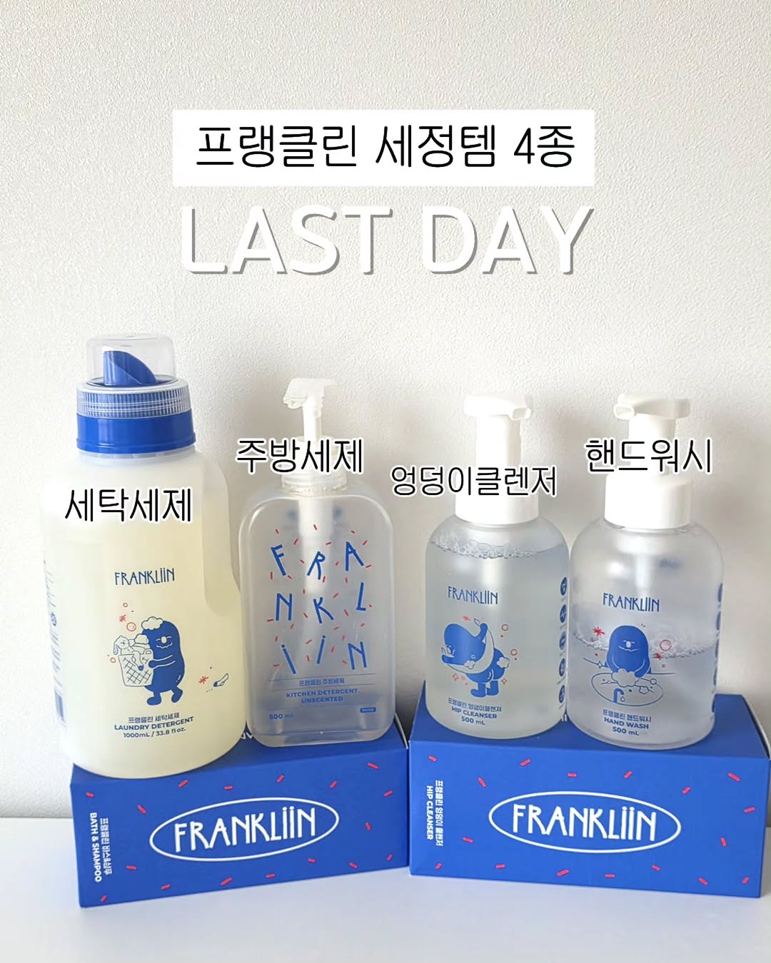 프랭클린 공구 오늘 자정 마감해요!💙 ㄴ주방세제, 세탁세제, 엉덩이클렌저, 핸드워시 💙국내 최저가+무료배송💙 🔗구매링크는 프로필 링크에 있어요! ___ 바스앤샴푸, 섬유유연제는 없는지.. 다른 제품 찾으시는 분들께 잠깐 설명 드리자묜... 벨라맘 프랭클린 공구 라인업은 매번 스토리 투표를 통해 결정하고 있어요! (프랭클린 공구는 한번에 4개씩만 가능해요ㅠ) 프랭클린은 벌써 3차 공구인데 역시 이번에도 주방세제, 세탁세제를 가장 많이 찾으셨더라구요! 엉덩이클렌저, 핸드워시는 저번 공구 라인업에서 빠졌더니 찾으시는 분들이 많으셨어용..!! 그래서 1~4위까지 라인업으로 구성해왔답니다..!! 다음 공구에는 라인업이 어떻게 바뀔지 모르니 어차피 써야하는 생활용품들이면 미리 쟁여두시는 걸 추천드립니다..!! 소비기한도 넉넉하니까요~ㅎㅎ ___ 프랭클린 공구 오늘 자정 마감해요! ㄴ주방세제, 세탁세제, 엉덩이클렌저, 핸드워시 💙국내 최저가+무료배송💙 🔗구매링크는 프로필 링크에 있어요! #프랭클린공구 #프랭클린