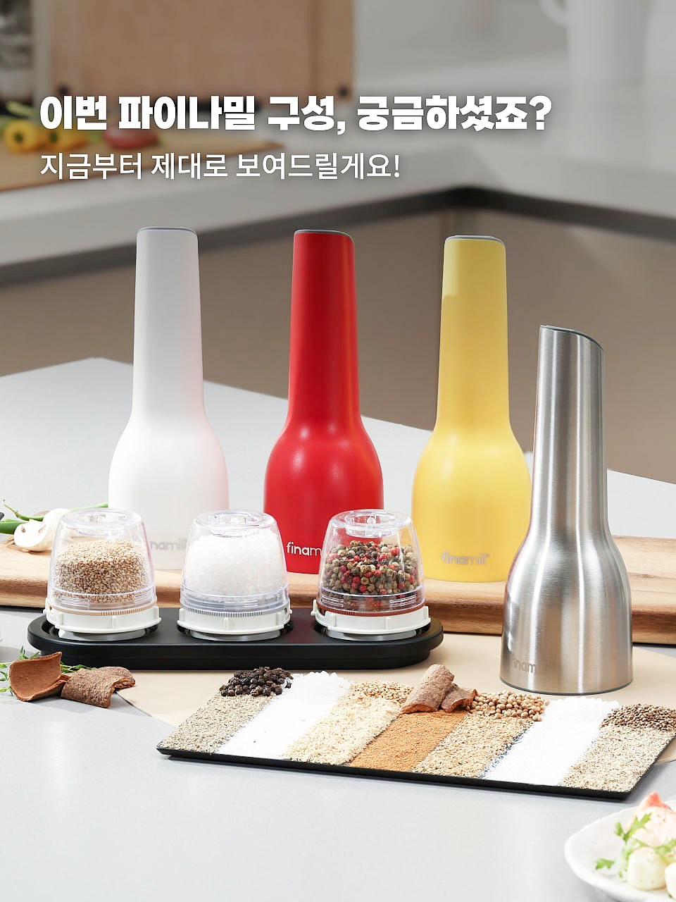 파이나밀 전동 그라인더는 소금, 후추, 깨를 간편하게 사용할 수 있는 주방용 아이템입니다. 다양한 색상과 추가 구성품으로 실속 있는 세트를 제공합니다.
