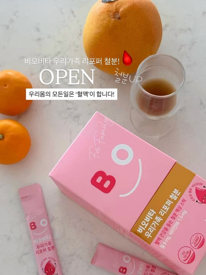 OPEN 비오비타 우리가족 리포퍼 철분 🌈4/22(수) 오전10시 ~ 4/26(일)🌈 🎁[아무댓글] 남겨주시면 오픈시 알림드리도록 하겠습니다~! ─────────── 🎁구매완료이벤트 구매완료❤️+휴대폰뒷자리 남겨주세요 스벅쿠폰 10명께 보내드릴게요~! ✅오픈런이벤트 6박스 이상 선착순 10명 담은수 1봉 증정! ─────────── 🩸피검사 했는데 철분부족 나왔다? 🤕이유없이 두통있고 어지럽다 😫평소보다 피곤하고 피로해소가 잘 안된다 🥶손발이 차고 추위를 잘탄다 🤪얼굴이 창백하다는 소리를 잘 듣는다 🤰🏻임신중이거나 출산 직후다 🥩고기섭취가 부족하다 😴자다가 잘 깨고 깊은잠을 잘못잔다 ✔️여기에 하나라도 해당되신다면..? 저흰 피검사했는데 철분부족 나왔어요 ㅠㅠ (둘째가) 처음엔 병원처방 철분제를 먹였는데요, 맛도 진짜 너무 없고 비린맛에 색깔도 시뻘건색이라 흘리면 일단 절단나고요.. 색이 빨간색이니까 분유에 타주면 일단 알아차려버림..😭 안먹어 안먹어 ㅠㅠ 응가 잘하던 울애기... 심지어 부작용으로 변비도 오더라고요 ㅠ 그래서 바꿨습니다😫 ✔️제가 출산 직후에도 철분스펙(?)은 그냥 당당하게 합격때릴만큼 철분 짱짱걸이라 울애기가 부족뜰줄은 몰랐고요 (그게 아이랑 무슨상관인지,,저도 참ㅎㅎ) ✔️생후6개월부터는 엄마로부터 받은 철분 저장량이 줄어 철분 보충이 필요한 시기인데, 아무리 잘 먹는 아이라도 부족이 뜨는 이유는 👉🏻철분 자체가 흡수율도 낮고 👉🏻음식으로 충족시키기 어렵기 때문입니다 ⭐️성장기 아이들 특히 필요하지만 ✔️특히 6개월에서 두돌 사이, ✔️그리고 한달에 한번 대자연의 날을 겪는 우리! 를 위해 챙겨보세요. 우리몸의 모든 일은 ‘혈액’이 하는데 혈액속 헤모글로빈의 주 성분이기 때문에, 매일 꾸준히는 아니더라도 생각날때마다 챙기고있어요 ✔️저는 맛없으면 안먹게 되더라고요 맛있고 거부감없이 먹을수 있는데다가, ✔️믿을수 있는 비오비타가 만들었어요 그래서 가격거품이 없고 성분또한 짱짱맨! 식물성 비헴철이라 체내 흡수가 용이한 형태입니다. 👉🏻가격까지 착해서 땡큐잖아? 특히 엄마들 이유없이 두통있다면 꼭 한번 챙겨보세요~!