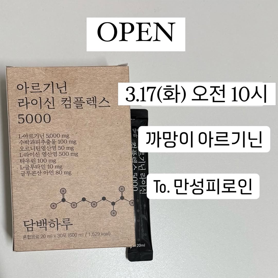 안녕하세요 매일 에너지가 넘치는 형제약사입니다 🎆 #공구안내 📌 매일 불금 만들어주는 까망이 아르기닌! “ 담백하루 아르기닌” 공구 알림 안내드립니다📌 공구이벤트 안내 드리자면 🎁 구매인증 이벤트 : 구매 후 “ 구매완료 + 뒷번호 4자리 ” 댓글 남겨주시면 추첨을 통해 10분에게 1box더 보내드릴거에요! 아르기닌 좋은지 알지만... 너무 많아서 어떤 제품을 먹어야할지 고민이 되셨죠? 수많은 아르기닌을 먹어보고 공구를 진행한 형제약사가 까망이 아르기닌을 가져왔습니다. 🎆제품명 : 담백하루 아르기닌 라이신 컴플렉스 5000🎆 🎆일정 : 3월 17일 화요일 오전 10시 Open🎆 제 사랑하는 패밀리님들에게 까망이 아르기닌 라이신 컴플렉스 5000 소개해드립니다. 제 스토리를 자주 보시는 분이라면 익숙한 제품이죠? 평일에는 약국장, 저녁에는 촬영 수요일엔 수요일 출장 주말엔 주말부부 등등 하루하루가 바쁜 형제약사입니다. 하루하루 스케쥴을 소화하기 위해서 꼭 챙겨먹는 개피곤 조합 중 하나인 아르기닌 제품입니다. 매일 불금 에너지로 만들어주는 까망이 아르기닌! 제품 퀄리티, 제품 구성, 제품 가격까지 모두 완벽한 공구 일정이니 꼭 구매해서 드셔보세요 :D ============================== 제품에 대해서 설명 한번 드릴게요! 📌 흡수- 보완 - 부스팅 시너지 배합 - 아르기닌5000mg, 시트룰린 100mg, 오르니틴 50mg은 흡수 시너지 - 라이신은 보완 시너지 - 글루타민, 타우린, 필수아미노산 8종, 아연, 엽산은 부스팅시너지 이 많은 성분들이 1포에 모두 들어있습니다. 📌 맛있는 청포도맛입니다. 📌 체내 흡수율이 높은 액상입니다. 📌1일 1회, 1포 섭취하시면 됩니다. =============================== 📌프로모션 안내📌 📍1박스 = 1개월분 입니다🔅🔅 1. 2박스=> 2개월분 80,000원➡️ 43,000원 46% off (1박스= 21,500원) 2. 4박스 => 4개월분 160,000원➡️ 79,900원 50% off (1박스=19,975원) 3. 8박스 => 8개월분 (패밀리구성 핵추천, 친구, 가족들끼리 같이 구매하세요) 320,000원➡️ 152,000원 53% off (1박스=19,000원) ============================