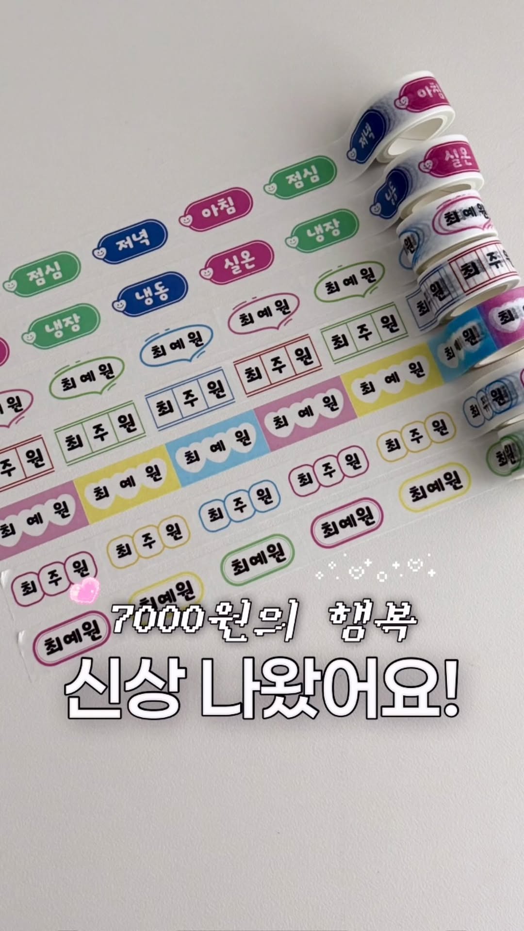 ♥️ 네임테이프 🏷️ 4월 30일 목요일 오전 10시 공구 오픈됩니다 🏷️ 댓글에 [ 알림 ] 이라고 써주시면 공구 오픈 후 알림 드려요 💛 지난번 공구때 구매하신 네임테이프 잘쓰고 계신가요 ?! 이번에 신상 나왔어요 !!!!!! 그래서 빠르게 가져왔어용 ㅎㅎ 디자인 더 다양해졌고 특히 아침 점심 저녁, 실온 냉장 냉동 이런 아이디어는 진짜 무슨 일이죠?ㅎㅎㅎ 어린이집 다니다보면 물티슈, 기저귀, 간식 소모성용품도 많이 보내야하는데 네임스티커는 쓰기 아깝잖아요 그럴때 요거 그냥 툭툭 붙여서 보내주세요 💛 이지컷 칼선으로 깔끔하게 떨어져요 💛 손으로 뜯으면 지저분하게 뜯기거나 가위가 필요하면 그것또한 귀찮은데 칼선이 다 있어서 그냥 툭툭 끊어만줘도 깔끔하게 떨어집니다 :) 고급 화지에 인쇄해서 이름 선명하고 다양한 표면에 붙였다 떼어네도 잔여물이 남지않아서 깔끔해요 저렴한 가격에 여기저기 선물하기도 좋고 쟁여놓으면 무조건 너무너무 잘쓸 네임테이프에요 🩷 💛 kc인증 완료된 안전한 제품 💛 🐰 공구가 : 7,000원 🏷️ 4월 30일 목요일 오전 10시 공구 오픈됩니다 🏷️ 댓글에 [ 알림 ] 이라고 써주시면 공구 오픈 후 알림 드려요 💛 💙 인스타 채널로 오시면 모든상품 공구 오픈 알람드려요 :)