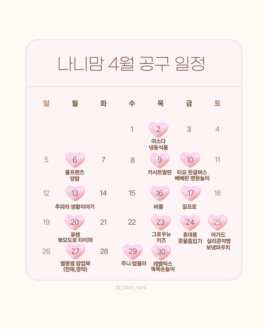 #나니맘_공구일정 [2026년 4월 공구 일정 안내] ✨ 💬 알림 신청 원하시는 제품은 댓글로 키워드 남겨주세요! 놓치지않게 답글로 알려드리겠습니다💛 키워드 다르게 여러개 달아주시는것도 대환영!!!! 3분 추첨해서 3000원 네이버페이로 쇼핑지원금 보내드릴게요🫶🏻 ┈┈┈┈┈┈┈┈┈┈┈┈┈┈┈┈┈ 🎁 3월 키워드 알림 댓글 당첨자입니다 🎁 저한테 디엠 한번씩 부탁드려요🥰 @sssss_eun @yiseo_mom2023 @seonwoo_jae ┈┈┈┈┈┈┈┈┈┈┈┈┈┈┈┈┈ 안녕하세요, 나니맘입니다😊 벌써 새학기 등원한지 한달이 지났네요! 우리 아이들, 이제 적응은 좀 잘했을까요~? 나니도 유치원가고 한동안은 낮잠이 없어져서 많이 피곤해했는데 요즘은 조금씩 적응한것같아요☺️ 낮잠이 없어지니까 육퇴가 빨라져서 좋기도한데, 그만큼 나니랑 보내는 시간이 짧아진것같아 괜히 아쉽기도 하더라구요🥹 참 엄마 마음은 늘 이런거죠..?💛 새로운 환경에 적응하느라 아이들도, 엄마들도 정말 고생 많으셨어요👏 4월 공구는 지난 한달동안 등원시키면서 “아 이거 필요하다!” “이건 하나 더 있어야겠다!” 이렇게 느끼셨을 아이템들로 준비해봤어요✨ ✔ 워킹맘 육아를 도와주는 냉동식품 ✔ 사도 사도 부족한 양말, 텀블러 ✔ 루틴 잡아주는 타이머 ✔ 콧물 시즌 대비 필수템 ✔ 요즘 꼭 필요한 나들이 준비템 ✔ 우리아이 성장 발달에 도움되는 것들까지💛 또 , 어린이날 다가오니까 선물 고민 많으시죠? 책이랑 장난감도 제대로 골라서 리스트업해봤어요🎁 항상 제가 먼저 이것저것 야무지게 써보고 후회없는 소비하실수있게 도와드릴게요💛 이번에도 하나하나 나니랑 직접 써보고 정말 괜찮다 싶은것들로만 준비했으니까 4월 공구도 많이 기대해주시고 관심 가져주시면 정말 감사하겠습니다✨ ┈┈┈┈┈┈┈┈┈┈┈┈┈┈┈┈┈ 📅 4월 공구 일정입니다 ♥️ 4/2 미소다 냉동식품 4/6 폴프랜즈 봄 양말 2차 4/9 카시트 발판 (베베루트, 니가드키즈4) 4/10 타요 한글버스 · 베베핀 병원놀이 4/13 추피의 생활이야기 4/16 바를 (선크림 · 로션 · 크림) 4/20 퓨핸 뽀모도로 타이머 4/23 그로우뉴 키즈 4/24 휴비딕 휴대용 콧물흡입기 4/25 아가드 실리콘 약병 & 보냉 파우치 4/27 별똥별 팝업북 (전래 · 명작) 4/29 주니 2in1 & 입모아 텀블러 4/30 레벨릭스 똑똑손놀이 ┈┈┈┈┈┈┈┈┈┈┈┈┈┈┈┈┈ ⚠️ 공구 일정은 변경·취소·추가될 수 있습니다. 변경되는 부분은 스토리로 바로 알려드릴게요!! ┈┈┈┈┈┈┈┈┈┈┈┈┈┈┈┈┈ 궁금하신건 언제든 DM 편하게 보내주세요! 늘 함께해주셔서 감사합니다☺️ #나니맘공구