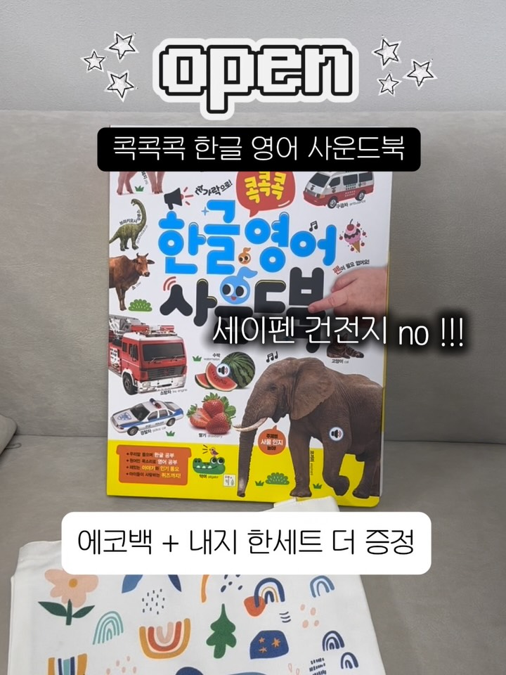 우리 아기 언어자극, 이거 완전 신박템이에요 👀💛 세이펜 ❌ 건전지 ❌ 손가락으로 콕 누르기만 하면 👉 그림을 단어로 또박또박 읽어주고 👉 생생한 효과음까지 🎵 ✔ 한 권에 15가지 주제 ✔ 330개 어휘 수록 ✔ 한글 + 영어 둘 다 지원 (일석이조 ✨) 거기다 🎹 피아노 연주 🎶 동요 듣기 ❓ 퀴즈 놀이까지 가능해요 그냥 단어책이 아니라 “놀면서 배우는 사운드북” 💛 가볍고 들고 다니기 좋아서 외출템으로도 딱! 📵 미디어 노출 대신 이거 어때요? ⸻ 🎁 이번 공구 혜택 ✔ 기존 공구가보다 더 저렴하게 ✔ 에코백 증정 ✔ 내지 1세트 추가 증정 👉 최대 혜택으로 챙겨가세요 💛 📅 공구기간 3일 오전 10시 ~ 6일 자정 댓글에 링크남겨주시면 최저가 링크 바로 보내드릴게요!! . #콕콕콕사운드북 #책육아 #책공구 #육아템 #육아꿀템