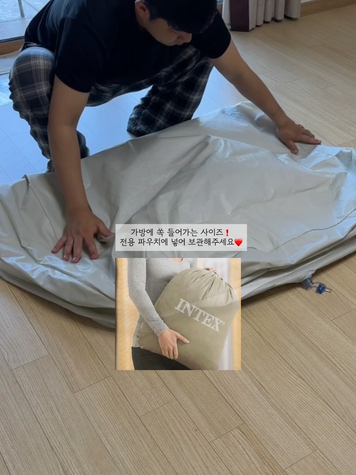 인텍스 키즈 휴대용침대 내일마감❤️ 바람 넣고 빼는 시간에대해서 문의 많이주시더라구요.ᐟ ㅎㅎ 자동펌프가 사진처럼 새로나왔어요! ㅎㅎ 넣을 때 5분 내외 바람 뺄때 주입구가 넓어서 누르면서 빼면 바람 정말 빨리빠져요.ᐟ 5분내로 항상뺐구요 수동펌프는 10분정도걸려요❤️ 인텍스 자동펌프는 +5,000원이라 타사에 비해 금액도 정말 좋은 구성이라 같이하시는걸 추천드려요.ᐟ 휴대용 침대말고 유용하게 쓰이더라구요🥰 직구템으로 유명한 이유가 있더라구요👀 직구는 10만원 넘는데… 👉 이번 공구는 4만원대부터 시작❗️ 이건 진짜 여행템으로 하나 쟁여두세요 📌 인텍스 키즈 휴대용 에어매트는 ✔️ 0-7세까지 넉넉하게 사용하는 사이즈 ✔️ 캐리어에 쏙 들어가는 휴대성 ✔️ 전용 파우치에 넣어 간편하게 쏙 ✔️ 잠잘 땐 침대 / 놀 땐 플레이매트로 2in1 활용 ✔️ 닿는 부분이 스웨이드 소재라 배김이 없고 폭신해요 이불 없이 써도 넘 잘자는.... ✔️ 고강도 PVC라 내구성까지 탄탄 ✔️ KC 인증 완료 ✔️ INTEX 본사 정품 ✔️ 휴대용 에어매트 브랜드 1위 ✔️ 간편한 공기주입 (수동펌프도 5-10분내로 가능) 별도 자동펌프는 5분내로 집에서 수동펌프로 했는데 생각보다 잘 되서 놀랬어요 ㅋㅋ 🏷️ 사이즈 / 무게 3.7kg 외부 107 x 168 x 25cm 매트리스 71 x 132 x 10cm 🏷️ 구성 : 본품 + 휴대용 수동 에어펌프 + 파우치 🏷️ 컬러 : 민트 / 아이보리 ✔️ 별도구매 비에스 자동펌프 🗓️ 일정 : 4/12 일 자정 마감 🚚 배송 : 12시 이전 주문시 당일출고 댓글에 “침대” 남겨주세요💌
