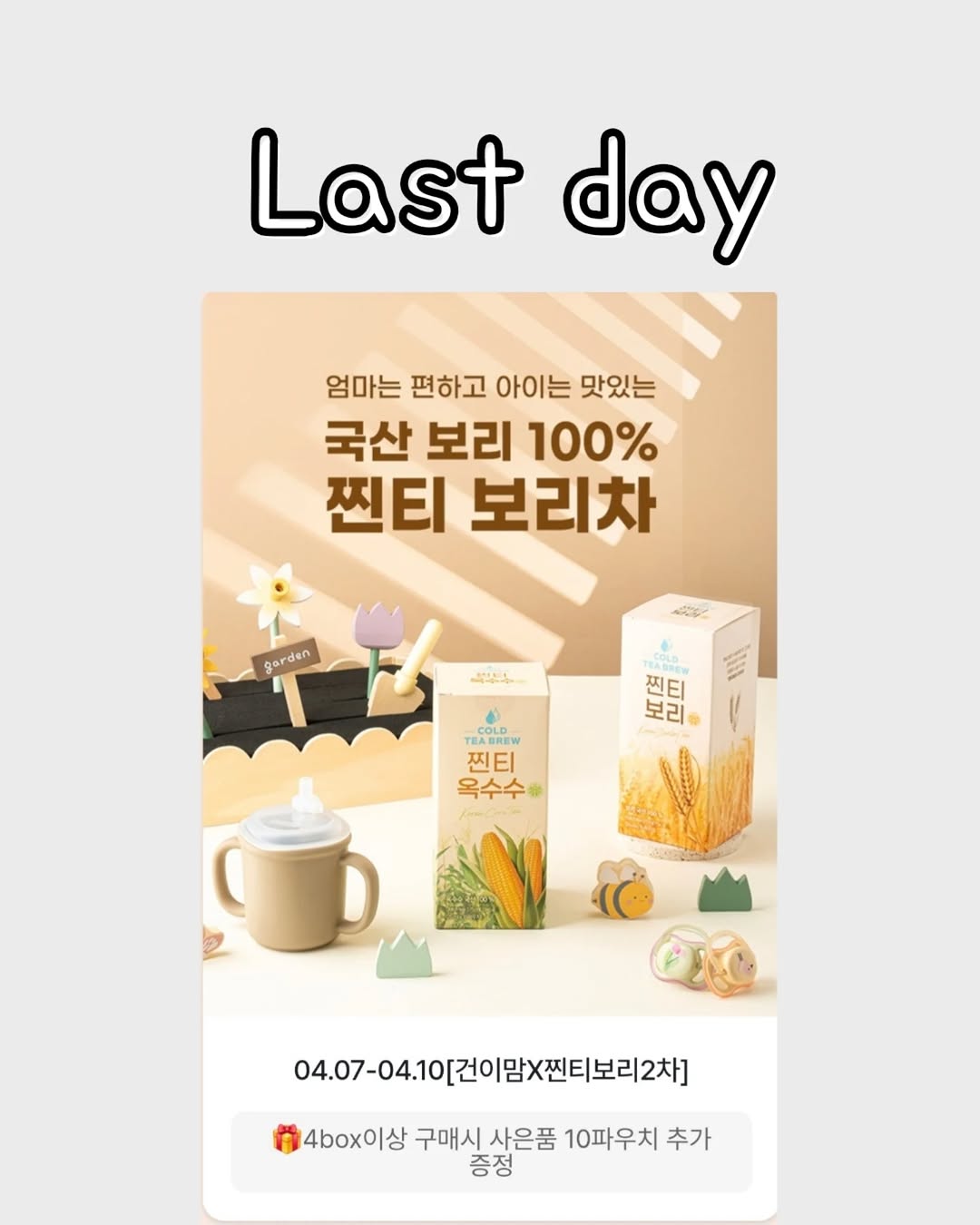 오늘 찐티 보리 · 찐티 옥수수 공구 마지막날이에요 🌾 보리차 하나 준비하려고 끓이고, 식히고, 옮겨 담고 은근히 손이 많이 가는 과정들… 육아하면서 한 번쯤은 다 겪어보셨죠😞 요즘은 날씨도 조금씩 따뜻해지다 보니 끓여둔 물도 더 신경 쓰이기 시작하더라고요 🥲 ✔️ 물에 한 번, 3초면 완성 ✔️ 100% 국내산 보리 & 옥수수 ✔️ 카페인·첨가물 없이 온가족 OK 외출할 때나 등원할 때도 한 포만 챙기면 되니까 물 준비가 훨씬 편해졌어요. 🎁4박스 이상 구매시 10포 추가 증정 ❤️구매 및 상품문의는 댓글또는 디엠 부탁드려요 ♥️프로필 하단링크 클릭 바로 구매가능하세요 💌댓글로 "링크" 적으면 구매링크 디엠 전송 ㅡㅡㅡㅡㅡㅡㅡㅡㅡㅡㅡㅡㅡㅡㅡㅡㅡㅡㅡㅡ 🎁구매완료 이벤트 1️⃣구매 완료 후 댓글로 인증(구매완료 이름) 예) 구매완료 김희정 2️⃣공구 마감 추첨하여 스타벅스 커피 쿠폰 보내드릴께요 (팔로워 분들만 이벤트 신청 가능해요) ㅡㅡㅡㅡㅡㅡㅡㅡㅡㅡㅡㅡㅡㅡㅡㅡㅡㅡㅡㅡ