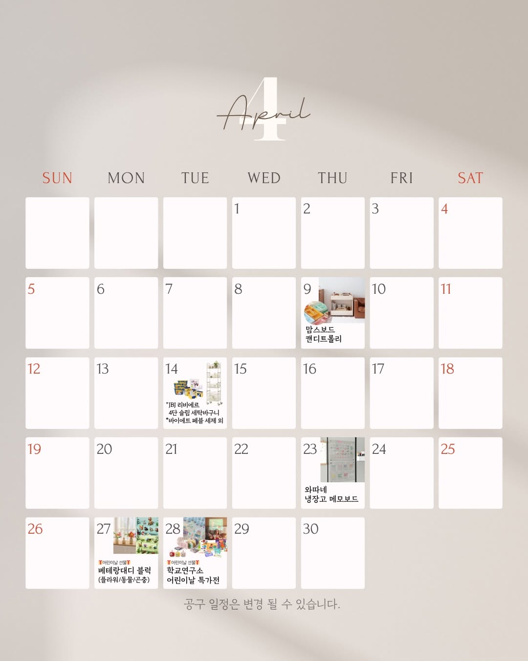 [🔮4월 공구일정🔮] 🟣맘스보드 캔디트롤리 북카트 (4/9~4/12) 인테리어의 완성💜 넉넉한 수납은 기본! 감각적인 컬러, 디자인까지! 정리템, 북카트, 인테리어템👌 오~래 사용하는 맘스보드 캔디트롤리🍬📚 🟣JBJ 리비에르 4단 슬림 세탁바구니 (4/14~4/19) 100% 국내제작, 304 올스텐으로 튼튼하고 위생적인 사용! 좁은 공간도 효율적으로 활용하는 슬림하고 모던한 4단 세탁바구니🧺 🟣바이에트 페블 세제 외 (4/14~4/19) 세탁 혁명! 신상품 더욱 강력한 표백&세척력 핑크캡슐 추가 진행✨ 베스트셀러 페블 세제, 이염방지시트, 드라이시트까지 완벽한 세탁 루틴! 🟣와따네 냉장고 메모보드 (4/23~4/26) 냉장고에 착! 우리 가족 스케줄러부터 식단 관리까지 한 번에📝 깔끔한 디자인으로 주방 분위기를 살려주는 고퀄리티 냉장고 메모보드 🟣베테랑대디 블럭 3종 플라워/동물/곤충 (4/27~5/12) 🎁어린이날 선물 추천🎁 아이들의 상상력⬆ 창의력⬆ 직접 조립하며 관찰하는 재미가 쏠쏠한 베테랑대디 블럭 3종🐝🌸 🟣학교연구소 어린이날 특가 (4/28~) 🎁어린이날 선물 추천🎁 학교연구소 베스트셀러 특가 이벤트! 육아가 쉬워지는 마법같은 육아템 모음! 역대급 혜택으로 만나보세요💕 🎁공구마다 오픈피드에 구매완료 댓글 남겨주시면(휴대폰뒷자리필요) 추첨을 통해 스타벅스 커피쿠폰 총 5분께 보내드려요☕️💜 ⭐️관심있는 항목 여기 댓글 남겨주시고, 알람+구매완료까지 남겨주시면 당첨확률🆙 🔮’학교연구소 커뮤니티’ 네이버 카페오픈🎉 📍바쁘지만,육아도 잘하고 싶은 엄빠샘을 위한 공간 학교연구소 자체제작 자료 및 정리된 정보들을 볼 수 있어요♥ 늘 믿고 구매해주셔서 감사합니다🫶🏻 ————————————————————— 🎁3월공구 이벤트당첨자는 차주에 따로 발표할게요🎉