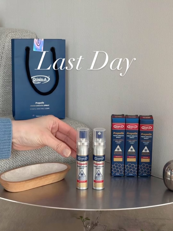 오리진에이 오늘 마지막 날이에요💙 승무원, 연예인들 가방 속 꼭 챙기는 관리템! 20년간 면세점 스테디 셀러 면세점이나 직구로 어렵게 구하던 그 제품을 가격도 착하게 만날 수 있는 기회🥰 오리진에이 프로폴리스 알고 나서부터는 겨울 내내 수시로 뿌렸더니 독감이 그렇게 유행할때도 저희 가족들 감기 한번 안 걸렸어요! 환절기인 지금도 목 칼칼하고 마른기침 날때, 목 부었을때 컨디션 안좋고 감기 걸릴것 같을때 무조건 칙칙 뿌리면 확실히 목이 편안- 다양한 프로폴리스를 사용해봤는데 쓰고 역한 냄새 때문에 도리도리 아이용은 또 너무 달고.. 결국 방치 오리진에이는 쓴맛 Zero! 설탕 Zero❌ 쓰지도 달지도 않고 프로폴리스 특유의 쓴 맛을 잡고 상쾌하고 청량한 맛이라 아이부터 어른까지 거부감 없이 사용가능해요! 이런 스프레이 제품 쓰다보면 노즐이 망가지는 경우가 많아 불편했는데 오리진에이는 제품 안정성을 위한 ✔️알루미늄 보틀사용 ✔️이탈리아산 미세분무노즐 사용 분사 시 액체가 흘러내리거나 뭉치는 현상이 없어요! 국내 최초 호주 공식 수입✨ 식약처 인증 건강기능식품으로 원료의 추출부터 생산, 품질 관리까지 100% 호주에서 수입되는 완제품이라 더 안심! ✔️하루에 3회 약 5회 분사해주세요. 1일 / 총 15회 정도 분사하는 것이 권장 용량이며, 수시로 사용하셔도 좋아요. 파우치에 쏙 들어가는 사이즈라 외출할 때 무조건 챙기게 됩니다 3개 세트 + 쇼핑백 구성이라 부모님 친구들 선물용으로도 좋아요🎁 📌이런 분들께 추천드려요! ▫️환절기마다 감기 반복되는 분 ▫️목 칼칼함 자주 느끼는 분 ▫️미세먼지, 황사에 예민한 분 ▫️말 많이 하는 직업 ▫️입냄새 제거 등 구강 관리 필요한 분 ▫️프로폴리스 쓴맛 때문에 포기했던 분 구매는 @zzinheart 프로필 링크에서 가능해요✨ 오늘 자정 마감합니다!