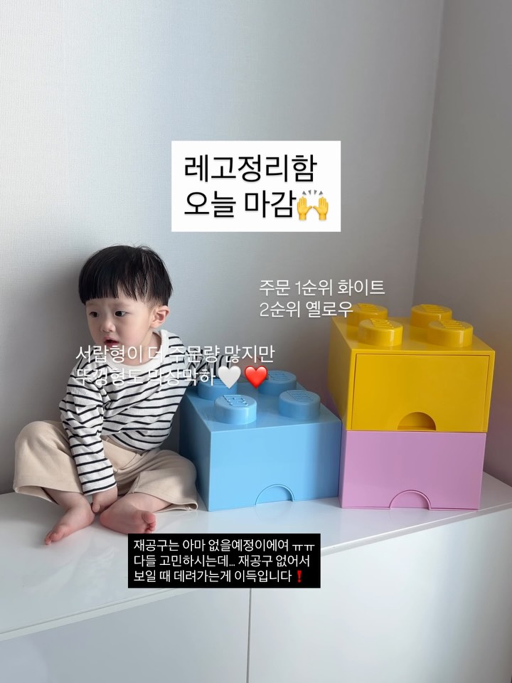 #공구마감안내 #레고정리함 #재공구는미정 ㅜㅜ 안녕하세요 율아맘입니다. 레고정리함 ㅠㅠ반응 폭발적인데 고민하시는 분들도 많으시더라구요. 재공구는 미정이고,,, 아마도 없을 가능성이 커서 보일 때 그냥 데려가시는걸 추천드립니다..🩶🤍 그리고 색상별로 재고가 있어서 만약 재오픈 하더라도 원하시는 색상이 없을 수 있어요! ㅠㅠ 솔직히 요거는 색상도 한몫 한다 생각하거든요. 화이트/ 옐로우가 잘나가고 서랍형이 주문 더 많지만, 뚜껑형도 못지않게 잘나가고 있어요. 공구는 오늘 자정 마감되니 놓치지마세요❗️ ——————- 💟댓글에 <링크> 달아주시면 바로 구매 가능한 링크 보내드릴게요❤️ 막차타세요!