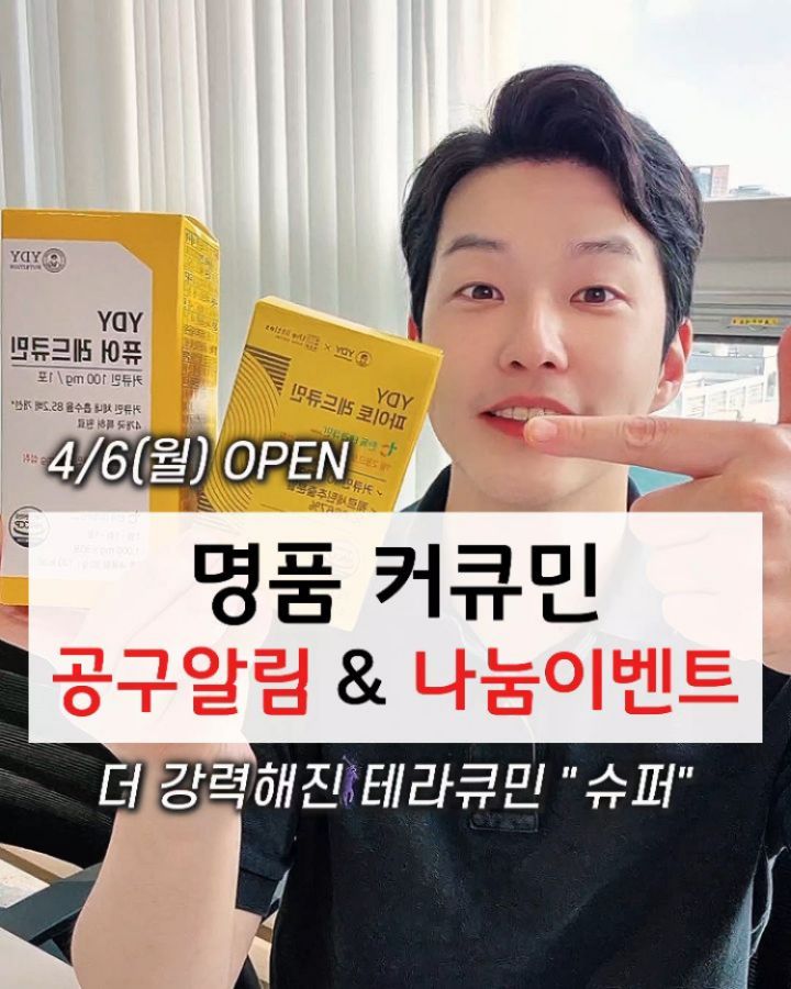 🔻공구알림 & 나눔이벤트 안내사항🔻 너무 많이 기다려주신 명품 커큐민 테라큐민"슈퍼" ✨️퓨어 레드큐민 & 파이토 레드큐민✨️ "4월 6일 월요일" ➡️ 드디어 돌아옵니다 다 같은 커큐민이 아닙니다 🙏 검증된 3대 커큐민 원료사중 하나인 "테라큐민" 그 중에서도 가장 윗등급의 프리미엄 원료인 ➡️ "테라큐민 슈퍼" 커큐민 입니다. ✅️ 요즘들어 몸이 예전같지 않으신 분들 ✅️ 에너지 넘치는 하루를 원하시는 분들 ✅️ 자꾸 트러블이 올라와 스트레스 받으시는 분들 ✅️ 가족력이 있어 미리 관리를 원하시는 분들 ✅️ 평소 빵이나 과자, 디저트를 좋아하시는 분들 ✅️ 반복되는 회식으로 힘들어 하시는 분들 ✅️ 나이가 들어 움직임을 불편하신 노년층 ✅️ 믿을 수 있는 원료의 커큐민을 찾으시는 분들께 추천드립니다 🫡 🎁 공구알림 이벤트 선물 🎁 ▪️댓글에 공구알림 적어주시면 ▪️총 10명 (각각 5명씩) 추첨해서 선물 보내드립니다. [선착순 아닙니다. 회사(YDY뉴트리션)에서 선정합니다] 본 공구 구매이벤트는 200만대 대규모 이벤트 계획중이니 본 공구도 많은 기대 해주세요🔥 📍퓨어레드큐민 [분말형, 순수한 커큐민] ✔️ 2박스 : 정가 98,000 ➡️ 공구가 54,000 (45%) ✔️ 4박스 : 정가 196,000 ➡️ 공구가 99,000 (49%) ✔️ 8박스 : 정가 392,000 ➡️ 공구가 182,000 (54%) ✔️ 12박스 : 정가 588,000 ➡️ 공구가 267,000 (55%) 📍파이토레드큐민 [정제형, 커큐민, 퀘르세틴200mg 복합성분] ✔️ 2박스 : 정가 110,000 ➡️ 공구가 88,000 (20%) ✔️ 4박스 : 정가 220,000 ➡️ 공구가 149,600 (32%) ✔️ 8박스 : 440,000 ➡️ 공구가 272,800 (36%) ✔️ 12박스 : 660,000 ➡️ 공구가 363,000 (45%) @yak_secret #커큐민 #레드큐민 #커큐민공구 #테라큐민 #테라큐민공구 Q) 레드큐민에 사용된 세계적 원료의 이름은?😃