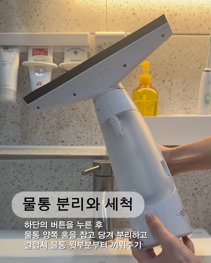 쓱퀴지 문의 많이 주셨던 오수 물통 세척 방법이에요~😊 모두 분리가 가능해 물로 세척할 수 있어 위생적이고 물통 위와 아래에 구멍이 있어 세척 후 건조도 빨라요 욕실의 물기나 창문에 맺힌 물기 제거 후 오수통에 물 버리고 매번 세척 하지 않고 저는 일주일에 한번 정도? 음료, 간장, 반려동물의 소변은 냄새가 배일수 있으니 이때는 세제 넣고 세척해주시면 좋겠죠~ 타사 전동 스퀴지보다 50g정도 더 가벼워 손목에 부담 없고 완충 후 약 40분 사용 가능하고 교체용 고무도 1개 더 보내드려요! 생활방수 IPX4단계 습기 많은 욕실에서도 안심~😌 📍물통 MAX 용량 기재에 실수가 있었는데 200ml가 아닌 100ml입니다 . . . #바이미룸#bymiroom#바이미룸공구#살림팁#쓱퀴지