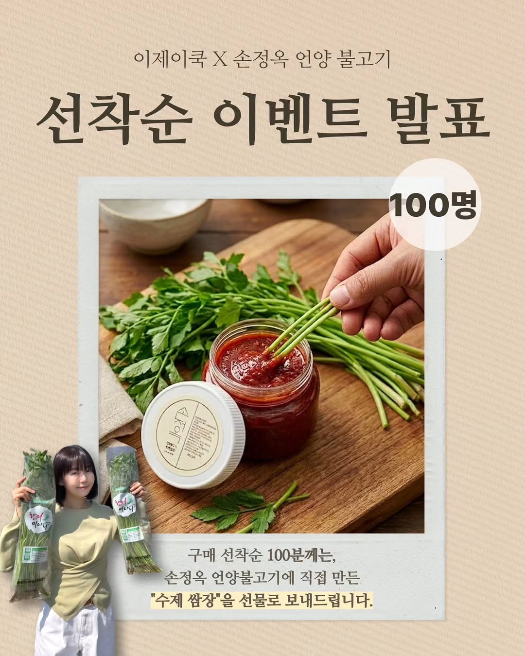 손언불과 청도한재미나리의 공동구매 이벤트로, 선착순 100명에게 수제 쌈장을 제공하는 특별한 기회입니다. 마지막 수량이니 놓치지 마세요!