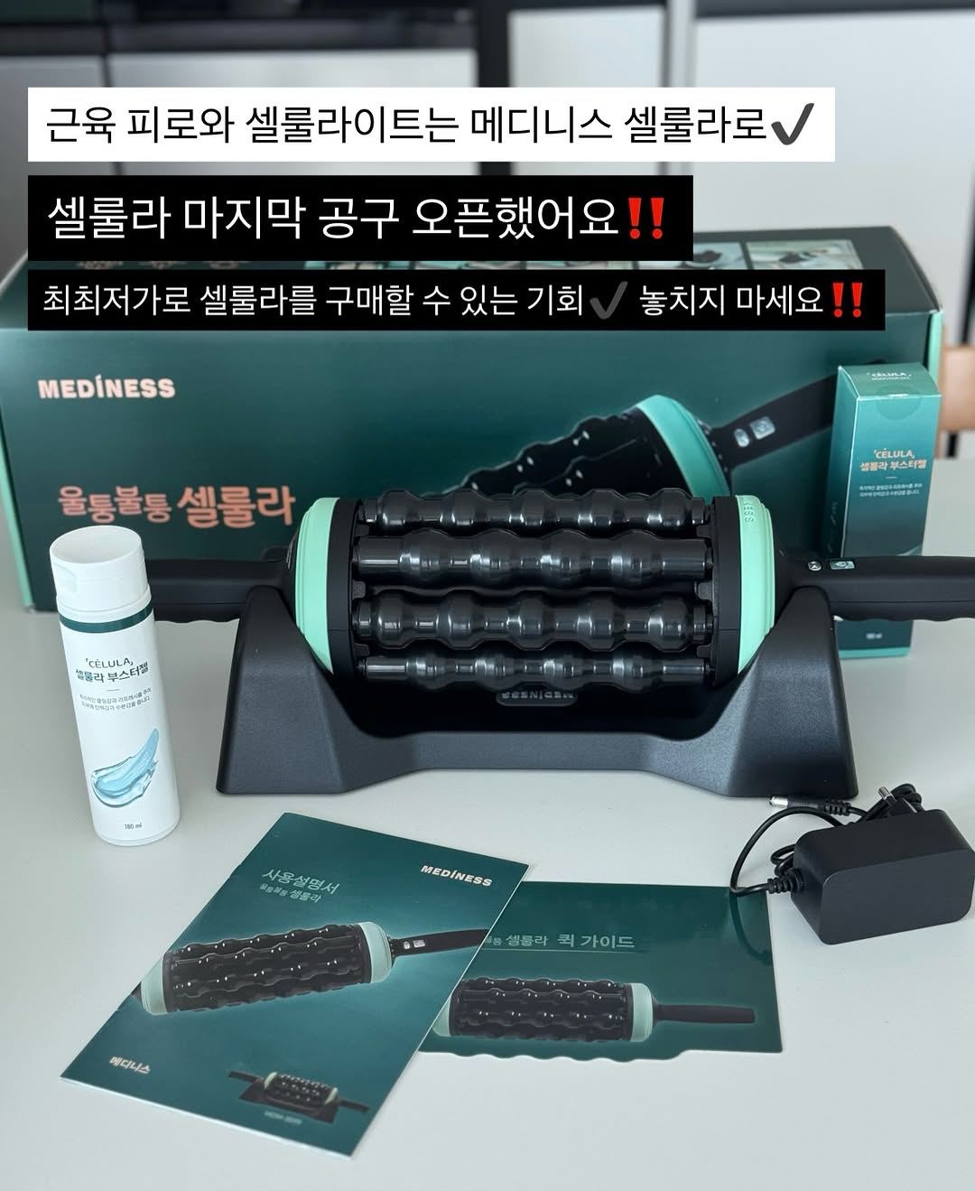 근육 피로와 셀룰라이트는 메디니스 셀룰라로✅ 셀룰라 마지막 공구 오픈했어요‼️ 이번 셀룰라 마지막 공구는 본사에서 기존 공구가보다 할인된 가격으로 판매할 수 있도록 해주셔서 진짜 최최저가로 진행됩니다 이 가격✔️ 이제 볼 수 없어요‼️ 최최저가로 셀룰라를 구매할 수 있는 기회✔️ 놓치지 마세요‼️ 18cm 면적, 8개의 롤러기둥과 36개의 지압볼이 피부 깊숙이 자극✔️ 다양하게 활용 가능한 넓은 마사지 면적으로 복부, 옆구리, 종아리, 햄스트링, 허벅지, 팔뚝, 발바닥까지✔️ 모두 관리 가능합니다 이제 근육 피로와 셀룰라이트는 메디니스 셀룰라로 관리하세요‼️ 울퉁불퉁 처진 피부탄력 360도 자신있게 메디니스셀룰라 ☑️ 분당 110회 고속 스핀 장치 + 마사지볼 ▫️ 부드러운 회전! 부드러운 자극! ☑️ 기술력이 만드는 차이 메디니스 자체개발 특허제품 ▫️ 국내 기술실용특허, 디자인특허 제품 ☑️ 울퉁불퉁한 허벅지 부위, 불룩한 옆구리 부위, 처진 팔뚝 부위 알배긴 종아리 부위, 처진 복부 부위까지 인체적용 시험완료‼️ ▫️ 셀룰라 + 셀룰라부스터젤과 함께 사용 중 최대 개선효과 ☑️ 정방향 역방향 방향 전환 가능 / 5단계 회전속도 ☑️ 다양하게 활용 가능한 넓은 마사지 면적 ▫️ 18cm 면적, 8개의 롤러기둥과 36개의 지압볼이 피부 깊숙이 자극 ☑️ 다양한 부위 사용 가능 ☑️ 충전형 무선 기기 / 멀티 거치대 / 스마트 타이머 ⠀ ⠀ #셀룰라 #셀룰라이트관리 #마사지기추천 #셀룰라공구