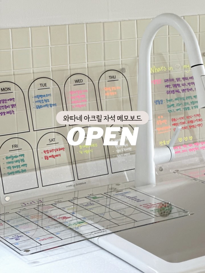 📌[공구오픈] 한 번 붙여두면 매일 편한, 우리집 필수템! 감성도 실용성도 완벽! 와따네 아크릴 자석 메모보드 공구📝✨ 📢아이들 루틴 만들기, 가족 스케쥴, 준비물까지 한눈에 정리하고 같이 확인하려고 산 냉장고 메모보드! 처음엔 가격 저렴한거 대충 샀는데 전용펜, 지우개 이것저것 사다보면 만원은 훌쩍! 막상 써보면 모서리 금방 까지고, 얼룩은 남고, 글씨 쓸 때 마다 흔들리고 들뜨고... 결국은 애물단지 됐던 경험, 다들 있으실 거예요😭 하나를 사도 제대로 된 걸 오래 쓰자는 마음에 들인 🤍와따네 아크릴 자석 냉장고 메모보드🤍 요고 하나로 온 가족의 일상이 달라졌어요! 온 가족이 함께 보고 챙기는 루틴이 자연스럽게 잡히고 아이도 숙제나 준비물을 스스로 계획하고 실천해나가는 매직🔮 심지어 소재도 비싼 아크릴 소재에 완제품이라 원래는 배송비, 포장비 부담도 큰 제품인데 이번 공구는 ⭐배송비 포함 1만원대⭐에 보드 개수만큼 마카, 지우개 등 사은품 증정 자석 안되는 냉장고(비스포크) 전용 패드 옵션까지! 알차게 팍팍 챙겨드리는 와따네 메모보드 공구🙌 ⬆⬆지금 프로필링크에서 득템하세요⬆⬆ 🔔와따네 아크릴 자석 메모보드 공구🔔 🟣공구 일정 : 4/23(목) ~ 4/26(일) 🟣공구 품목 & 금액➖배송비 포함 1만원대! ✅와따네 먼슬리 가로형 (화이트/블랙라인) ✅와따네 먼슬리 세로형 (화이트/블랙라인) ✅와따네 위클리보드 (화이트/블랙라인) ✅와따네 메모보드 (화이트/블랙라인) 🎁와따네 아크릴보드 구매 이벤트🎁 아크릴보드 구매 개수대로 전원 사은품 증정(사은품 A/B세트 택 1) ✔사은품 A : 미니마카펜 8P / 펜꽂이 1P / 보드지우개 1P / 실리콘 접착패드 4P ✔사은품 B : 자석보드마카 3P+미니마카펜 1P / 보드지우개 1P / 실리콘 접착패드 4P ✔자석 안되는 냉장고에서 사용 가능한 실리콘 패드8P, 옵션 선택시 증정! 📍 와따네 메모보드 핵심 포인트 ✔️아크릴보드+자석 일체형으로 조립 필요없이 탁! ✔️4면에 강력한 자석 내장으로 우수한 흡착력 ✔️완전밀착 디자인으로 흔들림 적고 안정적인 사용감 ✔️고급 투명 아크릴으로 인테리어 효과는 덤 ✔️마른천, 물티슈 등 쉽고 깨끗하게 지워지는 메모보드 ✔️먼슬리/위클리/메모보드 타입으로 용도별 선택 가능 ✔️자석 안되는 냉장고도 실리콘 패드 옵션으로 사용 가능 ✔️구매 고객 전원 사은품 증정 이벤트까지!! 📍 와따네 메모보드 옵션 선택 꿀팁 ✅와따네 먼슬리 가로형 40*30cm 한 달 일정을 넓게 보고 싶은 분 추천! 학교 행사, 가족 일정 등 월 단위 관리용으로 딱 좋아요👏 ✅와따네 먼슬리 세로형 30*40cm 세로형 배치가 더 깔끔한 분 추천! 냉장고 옆면이나 세로 공간 활용에 좋고 월간 일정을 차분하게 정리하기 좋아요🤗 ✅와따네 위클리보드 40*30cm 식단, 장보기, 학원 시간표, 준비물, 할 일까지 주간 단위 생활 관리에 가장 추천드려요🔥 예비초, 초등 저학년 루틴 잡기에도 강추! ✅와따네 메모보드 23*32cm 오늘 할 일, 독서/칭찬/보상 스티커판 등 다양하게 활용 가능해요! 큰 보드가 부담스럽거나 자유양식 필요한 분 추천해요🙌 📍자주 묻는 질문 모음 Q. 어떤 옵션을 골라야 할까요? 월 전체 일정 관리가 목적이면 먼슬리보드, 이번 주 루틴/식단/준비물 관리가 목적이면 위클리보드, 메모/전달사항/자유형식이 필요하면 메모보드 추천드려요! Q. 화이트보드펜, 지우개 이런 구성품은 따로 사야하나요? 보드 구매 개수만큼 사은품으로 마카펜, 지우개, 실리콘 패드 등 꼭 필요한 구성품을 받아가실 수 있는 혜택을 준비했어요! 따로 이것저것 준비하지 않아도 바로 사용하실 수 있어요👏 Q. 자석 안 되는 냉장고도 되나요? 네! 실리콘 패드 옵션으로 사용 가능해요. 자석 안 되는 냉장고용 실리콘 패드 8P 옵션 선택시 증정이라 비스포크 냉장고 쓰시는 분들도 함께 보시면 좋아요! 냉장고에 착! 붙이는 순간🤍 온 가족의 루틴과 스케쥴 관리가 훨씬 편해질 거예요! 아이도 스스로 보고 준비하고, 엄마는 덜 말하고 덜 챙겨도 되는 집안 시스템 완성🙆 완제품으로 조립 필요 NO! 배송비 포함해도 1만원대에 사은품까지 알차게 챙겨드리는 이번 공구! 저렴한 메모보드 여러 번 바꾸며 돈 쓰지 마시고 오래 두고두고 만족하며 사용할 수 밖에 없는 와따네 아크릴 자석 메모보드와 함께하세요💜