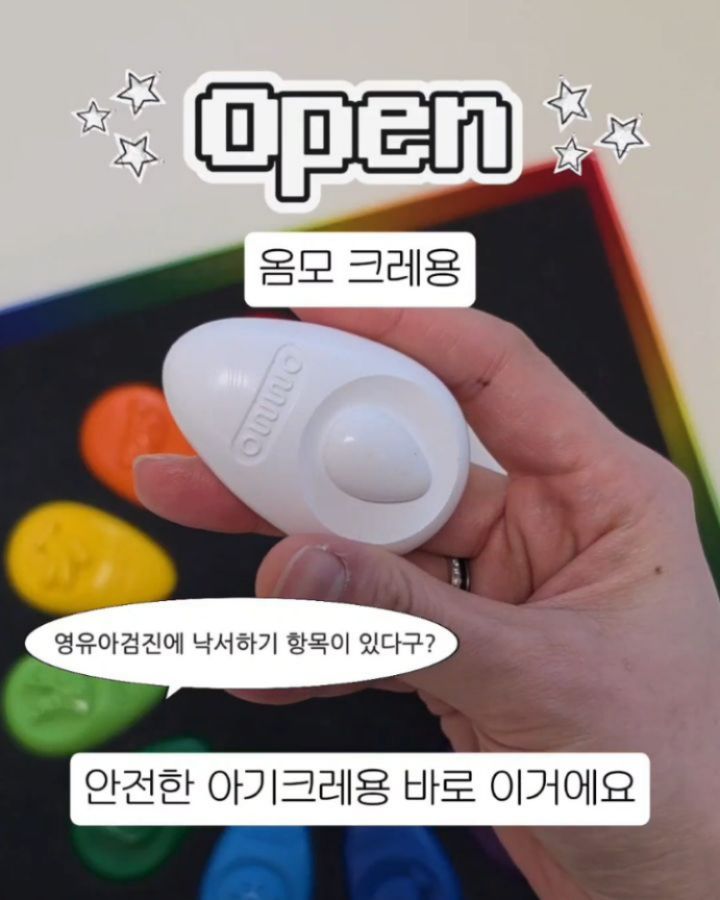 아기 낙서 연습에 적합한 옴모 크레용은 동글동글 조약돌 모양으로 아기가 잡기 편하고, 부러지지 않아 안전합니다. 손에 묻어나지 않고, 안전 테스트를 완료하여 안심하고 사용할 수 있습니다.