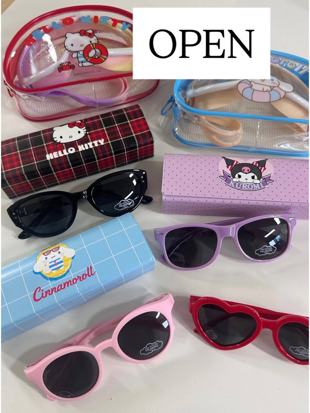 리뉴얼된 산리오 콜라보 키즈 선글라스와 스위밍 고글. UV400 자외선 차단렌즈와 편광렌즈로 기능성을 갖춘 제품입니다.