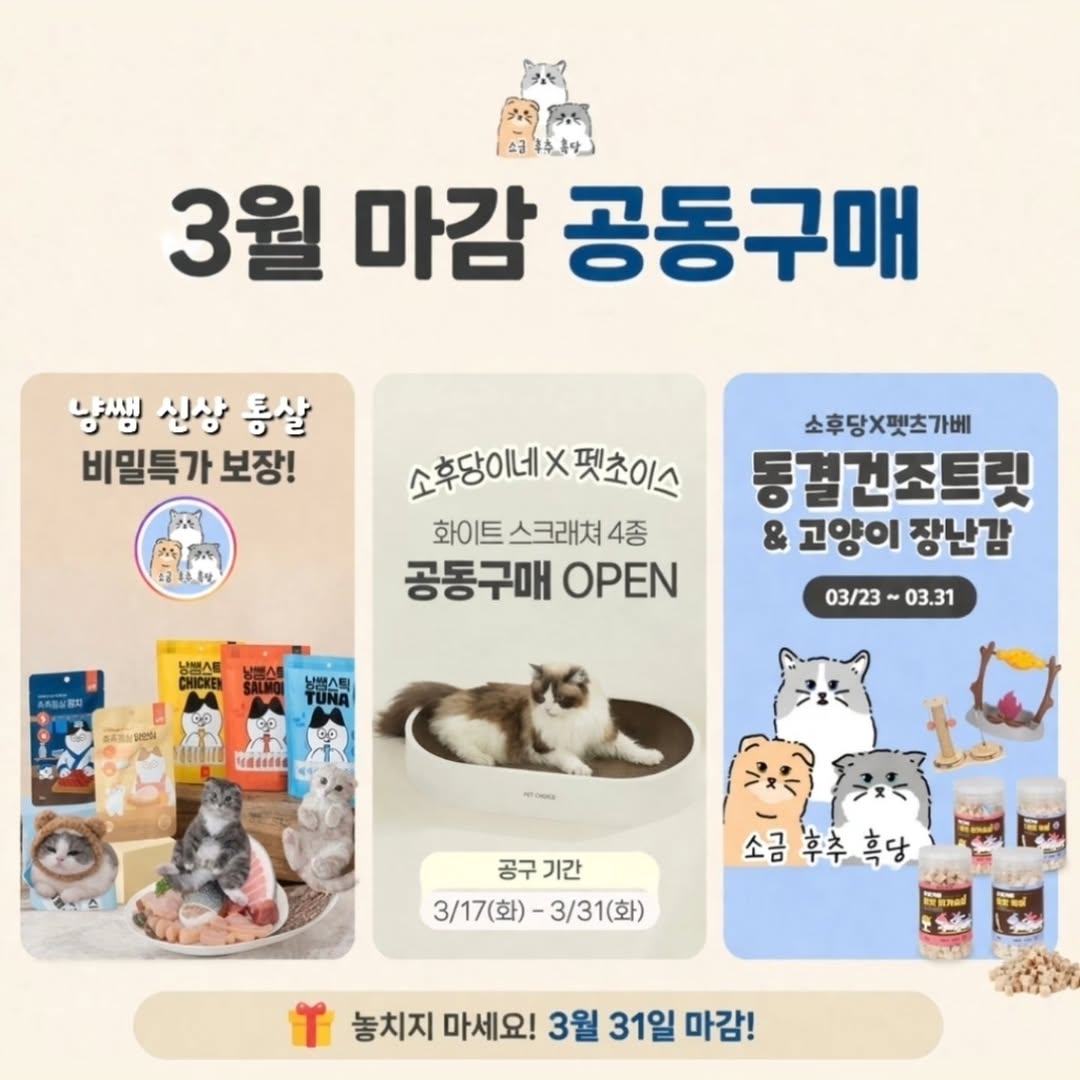 딱 히루에요 집사님들😱 🐟 냥쌤 촉촉 통살 🛏 n년째 계속 리필하는 펫초이스 스크래쳐 🧊 간식 + 놀이 같이 되는 동결건조 트릿 특히 통살 참치는 👉 신상인데 체험단으로 이미 집사님들 사이에서 극강의 기호성으로 난리났었죠👍🏻 궁금하셨던 집사님들 많을 것 같아서 이번에 같이 가져왔어요💕 나머지 제품들은 👉 이미 재구매 많은 제품들이라 선택하셔도 실패없으실거예요 💕 ⏰ 3월 31일 마감 필요하셨던 분들 막차 탑승 서둘어주세요🫶 💬 댓글에 “마감” 남겨주시면 공구링크 보내드릴게요✨