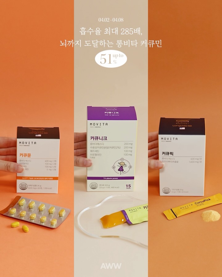커큐민중의 커큐민, 흡수율 최대 285배! 림프로 흡수되고 뇌까지 통과하는 커큐민은 롱비다가 유일해요🫚 커큐민의 치명적인 단점은 1%대의 낮은 흡수력과 낮은 생체이용률로 아무리 커큐민을 먹는다 한들 일반 커큐민은 불용성이라 장에서 잘 흡수가 되지 않고 흡수가 된다 하더라도 간에서 글루콘산과 결합해 혈액으로 배출되거든요 섭취해봤자 우리 몸에서 제대로 사용하지 못하고 대부분 대소변으로 빠져 나가는 커큐민은 소용이 없고 아무리 먹어도 커큐민의 혈중 농도가 오래 가지 못하고 생체이용률이 낮아 효과가 떨어지는데 ⭕️그래서 커큐민은 롱비다여야 해요 롱비다 커큐민은 입으로 먹었어도 소화기에서 소화되지 않고 🔅림프관을 통해 흡수돼 🔅간을 거치지 않고 🔅바로 몸에서 이용할 수 있는 형태로 작용하니까요! 림프를 통해 우리 몸 전신에 퍼지게 하고 심지어 ⭐️뇌 혈관 장벽까지 통과할 수 있음을 확인 받은 유일한 커큐민으로 커큐민에 관심을 갖고 잠깐만 찾아보셔도 만성 염증에 관한 내용이 아주 많이 보여지고 이 만성 염증이 원인이 돼 잔병치레부터 면역 등 우리 몸에 다양한 문제들이 생기는데 그럴 때 커큐민이 큰 역할을 하거든요 롱비다는 뇌 혈관 장벽까지 통과하는 유일한 커큐민이니 기억력이나 뇌 인지 개선 등이 필요한 어르신들에게도 추천드리고 집중력이 떨어지는, 전자기기를 많이 보는 아이들에게까지도 추천드립니다! 어떻게 해야 커큐민을 우리 몸에서 더 오래 잘 사용할 수 있을까를 고민해 만들어진 게 바로 이 롱비다커큐민으로 체내 흡수율과 생체 이용률이 떨어지는 커큐민이 우리 몸 안에서 285배 더 효과적으로 작용하고 커큐민의 혈중 농도가 일반 커큐민보다 100배 이상 더 높아 어떤 커큐민과도 그 효과가 다를 수 밖에 없게 해요 전세계적으로 붐인 커큐민이 궁금하세요? 좋은 커큐민좀 챙겨 먹어볼까 싶으세요? 그렇다면 정답은 롱비다예요! 압도적인 임상 연구 결과들이 말해주거든요 인체적용시험 등 커큐민 관련 연구 논문만 30,000여편을 검토해 엄선한 롱비다커큐민은 우리 몸 안에서 활성 커큐민을 가장 길게 유지하고 유일하게 혈관과 뇌 장벽까지 통과해 신경계까지 보호하면서 적은 양으로도 큰 효과를 발휘하니 🫚롱비다커큐민 고함량을 가장 효과적으로 섭취하고자 하신다면 커큐뮨(정제형)으로 선택해보세요 알약을 섭취할 수 있다! 가장 좋은 효과를 보고 싶다! 하신다면 커큐뮨이요! 🫚알약을 못먹는 아이들부터 어른들까지 롱비다커큐민을 가장 맛있게 섭취하고자 하신다면 커큐니크를 드시면 되니 걱정하지 마세요 (설탕을 첨가하지 않은 망고맛 젤리 타입) 🥭TOP젤리 망고맛 아시죠..? 설탕 없이도 맛있는 그 탑젤리 망고맛으로 너무 맛있어서 저도 자리에 앉아 몇포씩 까먹게 되거든요 사실 커큐니크를 두포를 드시면 커큐뮨 함량 이상이 되니 저처럼 맛있는 망고맛 젤리를 포기하기 어렵다 하신다면 커큐니크로 드셔보셔도 좋습니다..! 너무 맛있어서 문제!! 🫚일상에서 건강하게 부담 없이 온가족 함께 챙기기에는 커큐픽(분말)이 좋아요 특별한 맛 없이 무맛 무취의 아주 약한 고소한 분말이라 밥 지을때도, 주스에도 여기저기 추가해 먹을 수 있거든요 커큐뮨(정제형)은 하루 한번, 언제든 ✌🏻두알을! (필요시 5알까지도 섭취 가능) 커큐니크(젤리형)은 하루 한번, 언제든 한포 맛있게 챙겨드세요❤️ (하루 최대 5포까지 권장) 커큐픽(분말형)은 어디든 부담 없이 편하게 뿌려 온가족 챙겨 먹기 좋아요 임산부 수유부도, 12개월 이상의 아이들부터 모두 섭취 가능한 호르몬 교란 성분도 없는 4,000년 전부터 식품으로 먹어온 가장 안전한 허브성분이니 안심하셔도 됩니다 커큐민을 제대로 챙겨 드시고 싶으시다면 지금부터 8일까지 AWW에서 최대 51% 할인으로 만나요! @aww.co.kr Aww를 검색해 접속해주세요