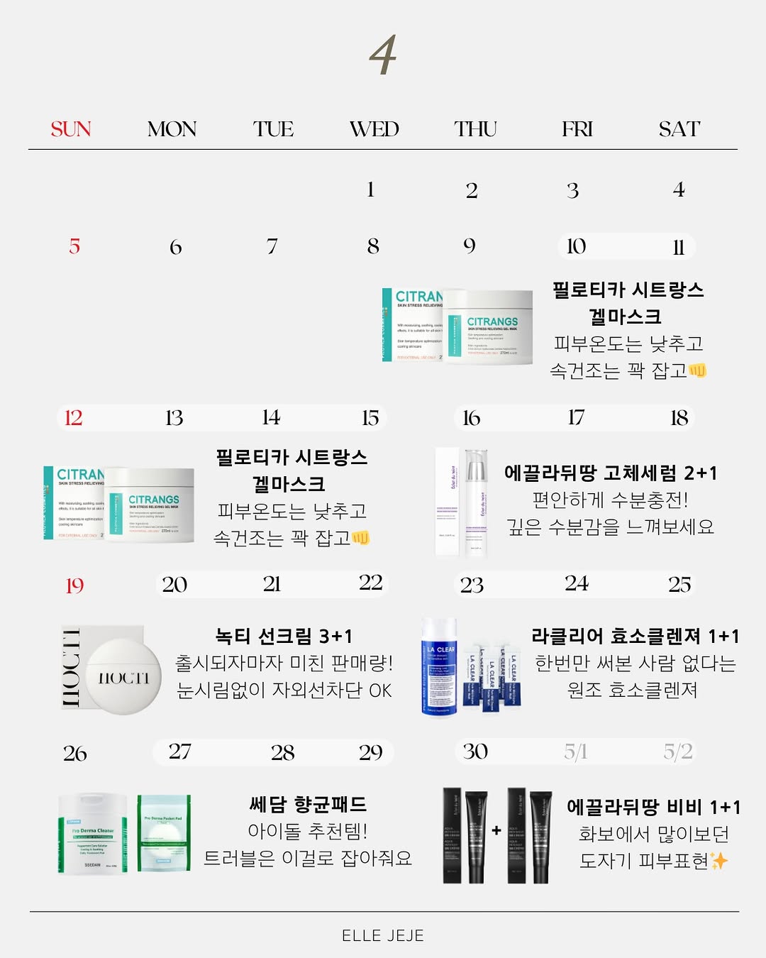 엘르제제 4월 일정 안내🌸 꽃보다 더 예쁜 내 피부 만들기 프로젝트! 저와 함께라면 너무 쉽습니다🫶🏻 이번달도 저만 믿고 따라오세용 팔로팔로미🙆🏻♀️ ✅ 필로티카 시트랑스 겔마스크 겔마스크 써본 언니들이라면 솔직히 요거 한번쯤은 다 보셨을듯요✋ 우선 엑토인이라는 성분이 피부진정에 증말로 좋은데 요걸 팩으로 만들어 버리니까 진정팩으로 최고자너유…….🫶🏻 쿨링감으로 홍조도 잡고 히알루론산 성분으로 수분충전까지💙 1석2조 아니 1석 3조 아ㄴㅣ…!!! 걍 집에 하나쯤 있어야되는 그런 필수템! ✅ 에끌라뒤땅 고체세럼 2+1 우리 에끌라뒤땅 제품들이 대체로 예민보스언니들, 기초 유목민언니들한테 많은 사랑을 받고있는데용 요 고체세럼은 빠지지않고 사랑받는 스테디셀러템 중 하나예용💙 일단 수분감부터 쫀득하니 미쳤구용 끈적이지 않고 실크처럼 챠악 발리는데 이러니까 보습이 그렇게 잘 되는구나 싶어요 그리고 가격도 워낙 괜찮은데 이번엔 무려 2+1 💖💖💖 빠른 소진 예상됩니다! ✅ 녹티 선크림 3+1 눈시림❌ 백탁❌ 수분감👌 요런 선크림 찾는다면 잘 찾아오셨어용 제가 또 요렇게 제품력 좋은애들은 기가맥히게 잘 찾아오거든요🙆🏻♀️ 일단 가격? 2만원 초반대로 너무 착하구용 50+ PA++++ 로 자외선차단까지 완벽!!!!! 선크림 유목민언니들이라면 무조건 오셔야해용 진짜루 자신있어요😎 ✅ 라클리어 효소클렌져 1+1 우리 라클이는 무슨 설명이 더 필요할까요,,💙 한번만 써본 사람 없다는 원조 효소클렌져! 우선 모든피부 사용 가능하구용 피부에 올리자마자 샤르르 녹는 피파인 효소로 피부 자극없이 클렌징 가능🙆🏻♀️ 평소엔 데일리로 사용하다가 가끔 모공까지 싸악 딥클렌징 가능하니까 경제적으로나, 기능적으로나 뭐 하나 빠지질 않음💙 선착순도 준비했으니까 알림필수! ✅ 쎄담 향균패드 유명 아이돌이 극찬한 바로 그 내돈내산 패드💚 트러블이 생기는 이유가 피지속 피지문제도 있고 자극에 의한것도 있고 여러가지가있지만 요런건 기초제품들로 충분히 케어가 가능해용! ❌근데 여드름균같은 유해균이 문제라면?!!?!?❌ 세균까지 싸악 닦아버려서 없애버려야겠쥬👊 유명 아이돌들이 너무나 사랑한다는 바로 그 패드💚 트러블 없이 예쁜피부로 봄을 맞이해요 우리✨ ✅ 에끌라뒤땅 재생비비 1+1 지난번 첫 런칭 이후 아주 반응 핫했던 우리 에끌라 비비크림💚 일단 화보에서 보이는 그 매끈하면서 챠르르광나는 피부표현 있죠? 딱 그 표현이 가능해지는 마법템이랄까요…🪄 근데 재생비비라 피부 회복에도 좋아서 레이져할때나 압출후에 발라줘도됨!!!!! 쓰임새가 여러모로 아주 딱인 똘똘한 녀석이에용🥰 이번에도 언니들을 위해 💖1+1으로 준비했지용💖 지난달에 놓친 언니들은 이번엔 꼬옥 오셔야해요!! 피부가 좋아질 수 밖에 없는 엘르제제 일정🌸 이번달도 저랑 같이 예뻐져용🪄