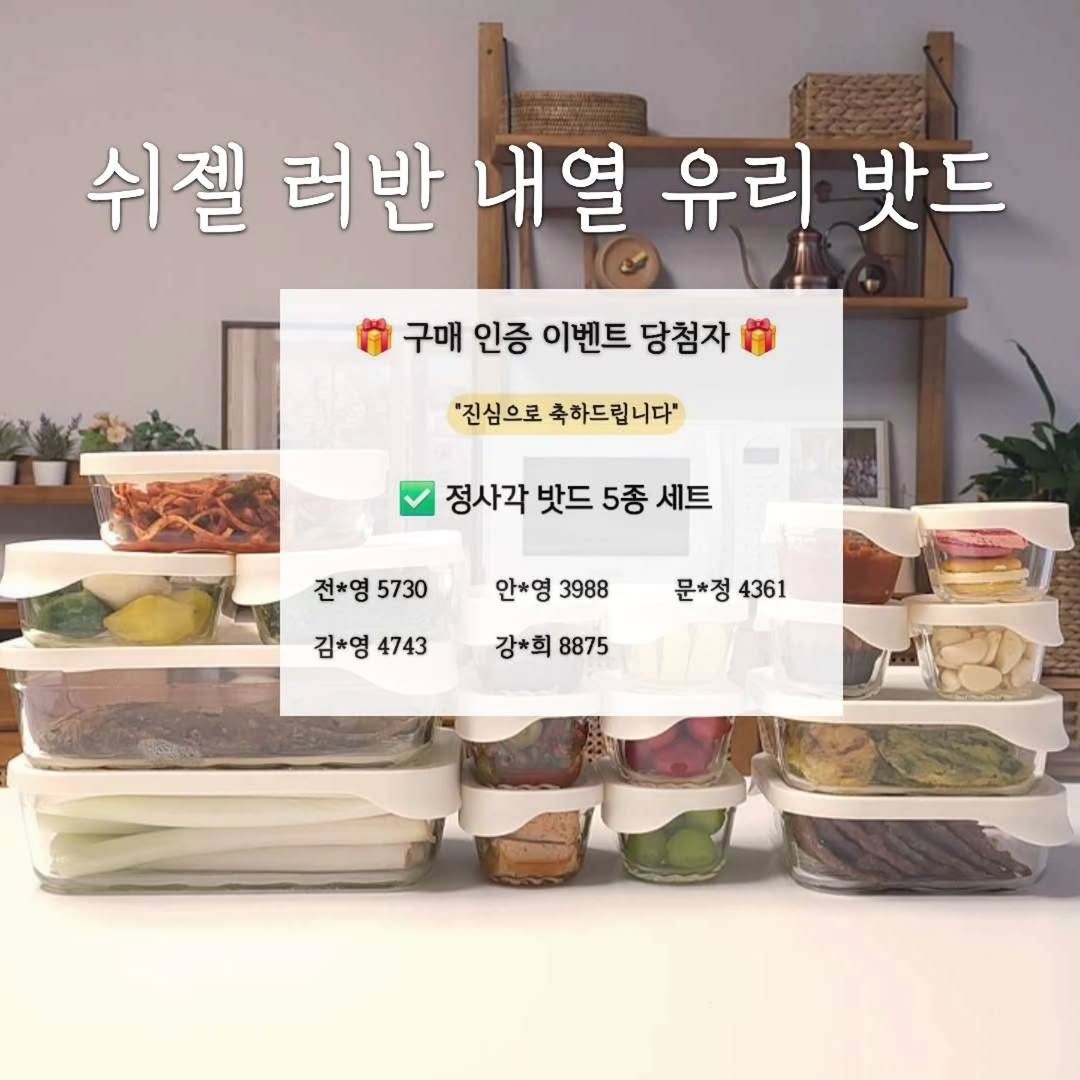 ❤️쉬젤 러반 내열 유리 밧드 / 쉐프윈 커퍼코어 시리즈 구매 인증 이벤트 당첨자 발표❤️ 여러분! 안녕하세요 홈그리나입니다☺️ 오늘은 얼마 전 진행한, 쉬젤 러반 내열 유리 밧드 / 쉐프윈 커퍼코어 시리즈 구매 인증 이벤트 당첨자 발표해요 ✔️이벤트 선물은 공지 후 일주일 내 배송됩니다 ▪️쉬젤 러반 내열 유리 밧드 🎁 축하드립니다 🎁 ✅️정사각 밧드 5종 세트 전*영 5730 안*영 3988 문*정 4361 김*영 4743 강*희 8875 ▪️쉐프윈 커퍼코어 시리즈 🎁 축하드립니다 🎁 ✅️304 올인원 스마트쿠커 송*용 1677 이*연 4959 ✅️햄튼 스터닝 키친툴 세트 조*진 9873 김*남 1277 ✅️네이버페이 1만 원 김*수 2926 황** 5697 조** 4433 매번 이벤트 당첨자 발표를 하다 보면, 한편으로는 기쁘고 감사한 마음이 크지만 또 한편으로는 모든 분들께 드리지 못하는 아쉬움도 늘 함께 느껴져요 ❤️😢 앞으로도 최저가 혜택뿐만 아니라, 다양한 이벤트와 즐거운 소식으로 찾아뵐 수 있도록 더욱 꼼꼼히 준비하고 노력할게요! 다음 이벤트 발표 제품은, ✔️닌자 에어그릴 ✔️샤크 Neo+ 청소기 ✔️이젠 이지클린 가습기 조금만 기다려 주세요! 2026년 새해 복 많이 받으시고 겨울 건강 유의하셔요💪 🔜 공동구매 예정 제품 ▪️알텐바흐 올뉴 티타늄 마스터(1/12) ▪️INGI 급속 해동기(1/15) ▪️엘리스앤클레어 미니 압력솥(1/26) ▪️쉬젤 러반 스텐 밧드(1/29) ▪️코렐 일렉 에어글라스 바사칸 에어프라이어 (일정 조율 중) #이벤트 #이벤트발표 #공동구매 #공구