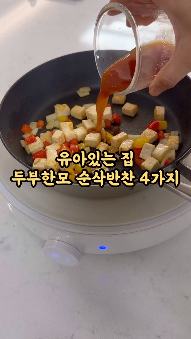 📍공구중(무설탕 요거트, 대나무 키친타올)⬇️⬇️⬇️ ‼️신맛 확- 줄인 무설탕 요거트(3/19까지) ‼️유아있는 집 안심사용하는 키친타올(3/22까지) 👉🏻더 자세한 제품정보&이벤트는 앞앞앞 오픈피드를 참고해주세요. ➖➖➖ 🙋🏻♀️안녕하세요:) 강미즈에요! 유아있는 집 단골식재료! 두부◻️ 특히 저희집은 두부반찬 정말 자주 해먹는데 만들때마다 다양한 맛을 낼 수 있어 더 자주 두부를 사용하게 되는거 같아요. 오늘도 두부로 4가지 초간단 반찬 만들어봤어요! 🏷️두부 샐러드 1️⃣두부(1/4조각)을 전자렌지에 1분 쪄서 물기를 좀 더 빼주기 2️⃣키친타올로 한번더 물기를 닦아 완전히 식혀 작은 사이즈 큐브로 썰기 3️⃣작은 볼에 두부,샤인머스켓,방울토마토를 1:1:1비율로 넣고 무설탕 요거트(50ml), 땅콩(1스푼)넣고 골고루 섞기 *현재 공구중인 무설탕 요거트는 신맛이 적어 샐러드 드레싱으로 정-말 잘 어울려요!! 🏷️두부 무침 1️⃣두부(1/4조각)을 적당한 크기로 썰어 키친타올로 물기제거 2️⃣오일 뿌린팬에 두부놓고 노릇하게 구워 불끄고 만능멸치야채(소금보다 넉넉히)뿌리고 참기름(2스푼)추가해 섞기 🏷️두부 찹스테이크 1️⃣두부(1/4조각)을 작은 큐브로 썰어 키친타올로 물기제거 2️⃣오일 뿌린팬이 두부,파프리카,양파넣고 노릇하게 볶기 3️⃣케첩(1스푼),불고기소스(반스푼),물(30ml)를 섞어 붓기 4️⃣중약불로 졸여 마무리하기 🏷️계란 두부부침 1️⃣ 두부(1/4조각)을 적당한 크기로 썰어 키친타올로 물기제거 2️⃣두부위에 감자전분가루, 만능멸치야채 뿌린후 계란(1개) 잘 풀어 묻히기 3️⃣오일 뿌린팬에 노릇하게 굽기 *두부를 구운다음 남은 계란물은 마지막에 모두 부어 구워먹기 오늘도 강미즈레시피를 보러와주셔서 진심으로 감사해요😍