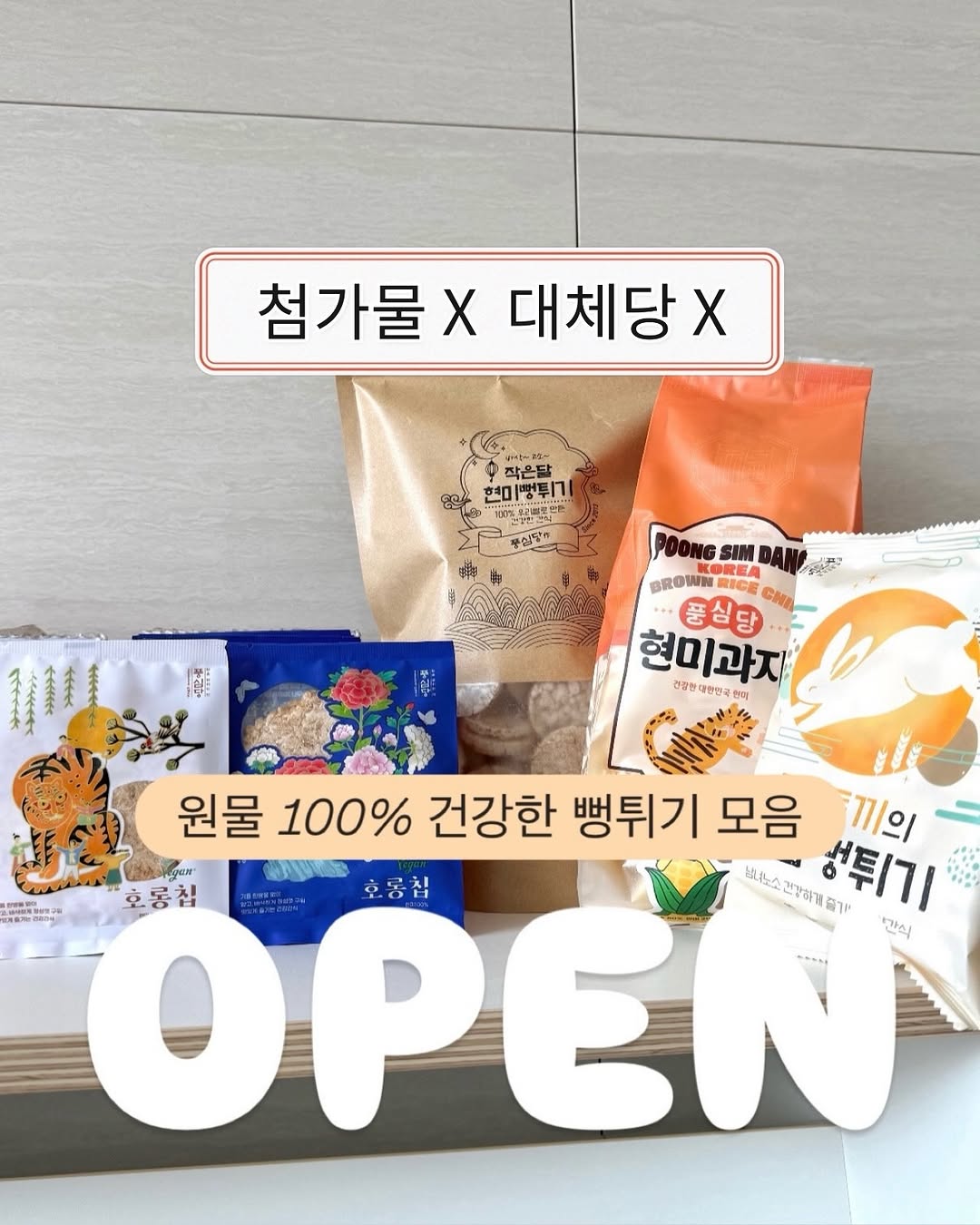 풍심당의 무첨가 간식으로 뻥튀기와 누룽지칩을 포함한 다양한 구성의 제품입니다. 건강한 성분으로 만들어져 다이어트 간식으로도 인기가 많습니다.