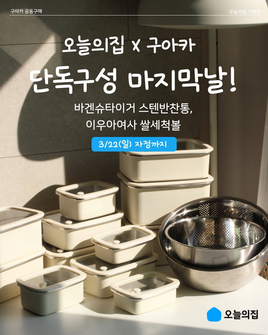 구아카와 오늘의집의 콜라보로 진행되는 스텐반찬통과 쌀 세척볼의 공동구매입니다. 전자레인지 사용 가능하며, 무료배송 혜택도 제공됩니다.
