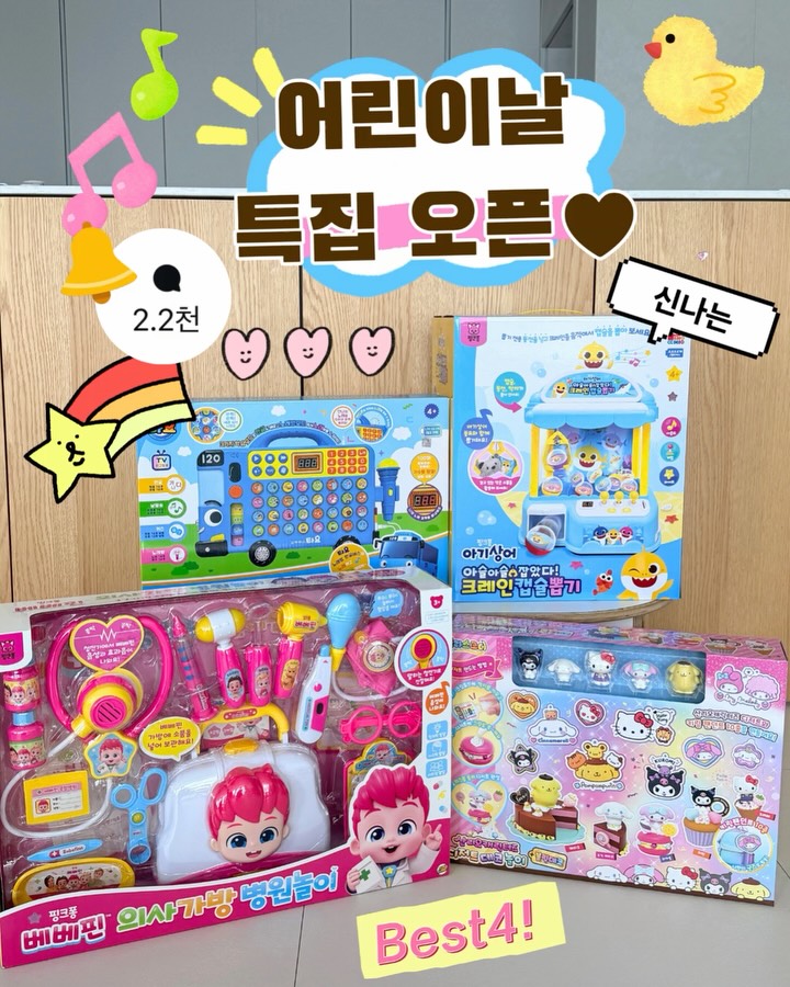 OPEN 어린이날 맞이 인기핫템 4종 준비완료! 🌟4/7(화) ~ 4/9(목)🌟 🚨알림댓글 2천2백개 돌파중🚨 꼭 모두 할인가격으로 겟!!하세요🔥🔥🔥🔥 💌[아무댓글] 남겨주시면 지금바로 특가링크 디엠전송 드리겠습니다🩷 ─────────── 🎁구매완료 이벤트🎁 구매완료❤️+휴대폰 뒷자리 남겨주세요 엄마선물!! 스벅커피쿠폰 (20명)께 보내드릴게요💖 ─────────── 🌟지난번 티니핑 특집때 남아는 웁니다ㅠㅠㅠ 댓글 많이 남겨주셔서 이렇게 찾아온...!!! 🌟전부 핫템 잇템 인기템 4종으로만 준비완료!!! 가격비교는 싹 - 마쳤고😎 어린이날/조카선물/생일선물 그냥 한방에 해결이쥬-! 🌟개인적으로는 만들기 좋아하는 친구들 산리오캐릭터즈 디저트데코놀이& 블링데코세트 진짜 강추해요!💖💖 🌟주말에 하루종일 만들고 놀았는데 자기 직전에 “엄마 오늘 나 그거 디저트 만들기해서 너무너무 행복했어 재밌었어“ 라고 말하더라고요ㅠㅠ 만들기 좋아하는 친구들이면 강추해볼게요👍🏻 ✅라인업 4종 1️⃣아기상어 멜로디 크레인 캡슐뽑기 👉🏻인형뽑기 2️⃣산리오캐릭터즈 디저트 데코놀이&블링데코세트 👉🏻디저트 만들고, 키링만들고 하는 꾸미기세트 3️⃣타요노래하는 한글버스 👉🏻한글/동요 나오고, 노래방으로 변신하는 타요버스 4️⃣베베핀 의사가방 병원놀이 👉🏻병원놀이 다 놀고 가방에 정리 싹 가능 🌟3~6만원대로 준비완! 🚚배송비 ✔️크레인캡슐뽑기-무료배송 ✔️그 외 배송비 3천원 (6개까지 합배가능) #어린이날선물 #조카선물