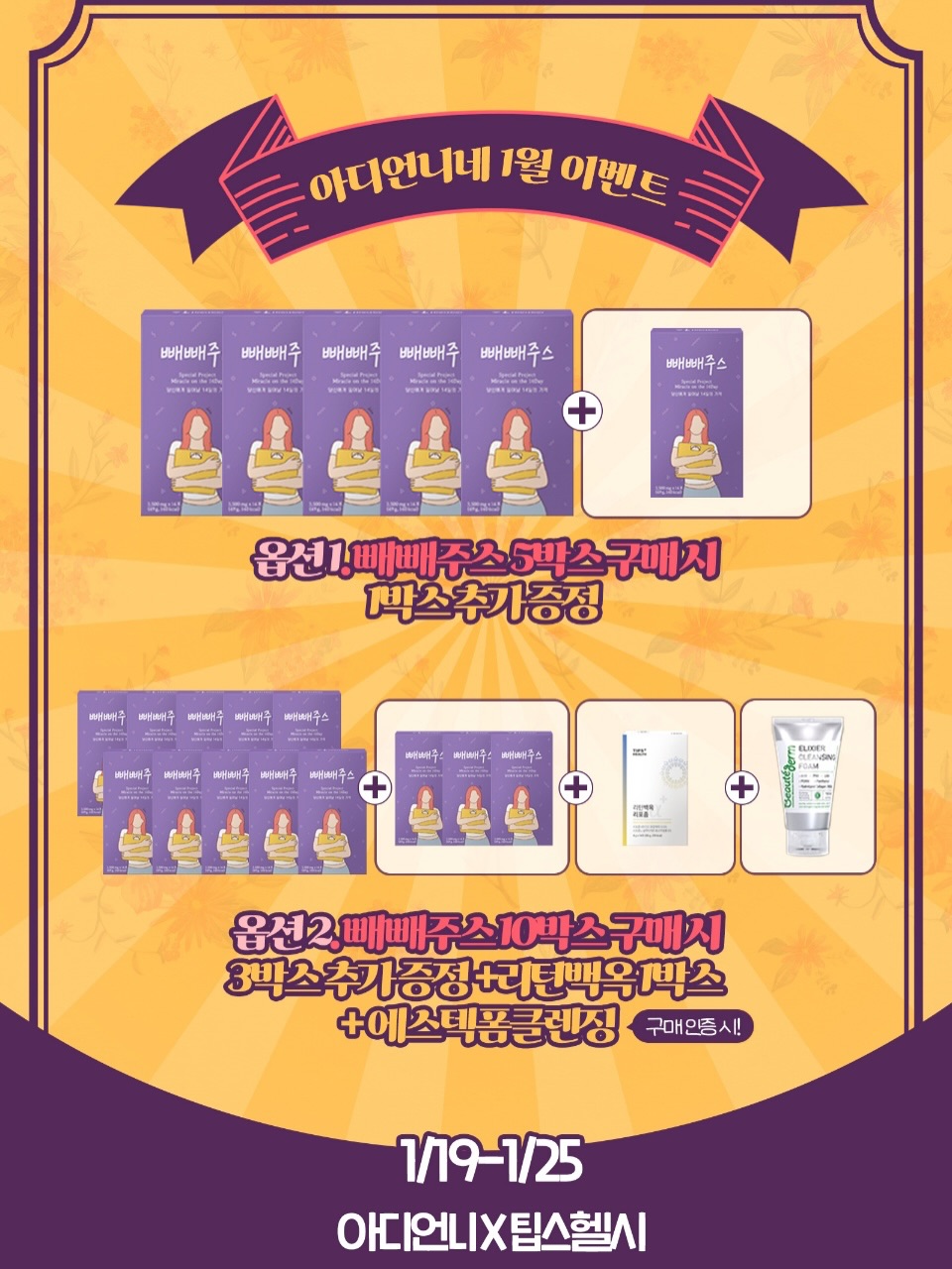 당 0g 천연성분으로 몸매관리를 도와주는 보라 빼빼주스와 리턴백옥 세트를 공동구매합니다. 1월 19일부터 25일까지 신청 가능하며, 다양한 혜택이 포함되어 있습니다.