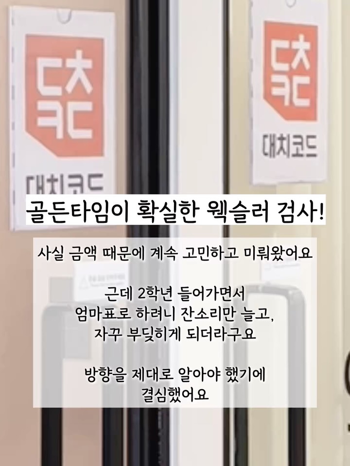📌불안에 휘둘리는 사교육❌ 우리 아이를 제대로 알고 시작하는 교육⭕ 대치동 전문가의 학습 로드맵, 대치코드 웩슬러검사&컨설팅🎯 목요일까지입니다‼️ 📢AI시대가 오면서, 없어지는 직업도 많아지고 교육의 기준도 정말 빠르게 바뀌고 있는 요즘! 이제는 무조건 많이 시키는 교육보다 우리 아이가 무엇을 잘하는지 알고, 그 강점을 제대로 키워 학습과 진로까지 연결해주는 것이 휠씬 더 중요해지고 있어요! 그러기 위해 가장 먼저 필요한 건 ⭐바로 우리 아이를 제대로 파악하는 것!⭐ 그리고 그걸 가장 객관적으로 확인할 수 있는 방법이 바로 웩슬러검사&학습컨설팅이라는 사실💜 🔥알고보니 학군지 엄마들은 이미 웩슬러검사&컨설팅으로 학습부터 학원 선택까지, 훨씬 더 체계적으로 방향을 잡고 있었어요! 특히 어떤 전문가에게 컨설팅을 받느냐가 정~말 중요하다고 하더라구요! 수준 높은 컨설팅으로 학습의 방향을 제시하는, 소비자 만족도 1위! 대치코드 웩슬러검사&컨설팅 공구 오픈했어요🙌 📢선착순 프로모션 진행 중! 댓글 달아주시면 DM으로 대치코드 프로모션 정보 보내드려요! 🔔대치코드 웩슬러검사&컨설팅 공구🔔 🟣공구 일정 : 3/30(월) ~ 4/2(목) 🟣예약가능 기간 : 2026년 7월 31일까지 🟣대치코드 웩슬러검사&컨설팅 진행 방식 1️⃣ 온라인 사전 검사 진행(4종) ✔️부모 - 부모양육태도검사/기질성격검사 ✔️아이 - 진로탐색/문이과검사 2️⃣ 오프라인 검사(을지로 본사) ✔️부모 - 학부모 사전 상담 진행 ✔️아이 - 웩슬러 지능검사 진행 3️⃣ 검사 리포트 전달 ✔️이메일로 17P 분량 검사 리포트 전달 4️⃣에듀카운슬링 (1:1 화상상담) ✔️일정 조율 후, 1시간 내외 에듀카운슬링 진행 ✔️상담 후 재시청 할 수 있도록 녹화본 제공 ⚠추천인코드를 입력해주셔야 할인 적용됩니다!! 📍대치코드 특징 한눈에 보기 ✔2025 웩슬러 지능검사 소비자 만족도 1위 (만족도 4.8) ✔기질 및 성격검사/부모양육태도검사/웩슬러검사(최신 개정판) ✔아이 기질·성격·강점·약점·문이과 성향까지 종합 분석 ✔18페이지 이상 전문적이고 자세한 검사 레포트 제공 ✔전문가와의 화상 에듀카운슬링 진행(1시간 내외, 녹화본 제공) ✔대치동 출신 전문가의 학습 로드맵 솔루션 제공(놀이/학원/교재) ✔아이 기질, 성격에 따른 부모 양육 방식, 학습 방향과 방법 제시 ✔약점 강화 방법, 과목별 공부 방법까지 구체적으로 제시 🍯꿀팁 ✔검사 리포트 받아본 다음 AI로 결과지 한번 분석해보고 질문사항들을 정리해서 1:1 화상상담에 참여하면 더욱 만족할 수 있는 상담 가능해요! (질문이 나중에 생각나는 편...🤫) ✔엄마, 아빠가 함게 참여하면 교육의 방향을 하나로 모을 수 있어요! 📍대치코드 자주하는 질문 모음 Q. 대치코드와 다른 웩슬러검사랑 차이가 있나요? A. 대부분은 검사+결과지+간단한 해석정도로 끝나지만 대치코드는 학업 중심 웩슬러 지능검사 결과 해석과 아이의 기질, 성격까지 고려한 학습 로드맵까지 연결됩니다! Q. 웩슬러검사는 언제 받는 게 좋나요? A. 검사 시기가 따로 정해져 있는 건 아니에요! 아이의 기질과 성향, 학습 방향이 궁금할 때라면 언제든지 진행 가능합니다. Q. 한 번 받으면 끝인가요? A. 정해진 주기는 없지만, 보통 2~3년 주기로 다시 방문하는 경우가 많아요! 더 중요한 건 단순한 시기보다 성적, 집중력 변화나 어려움, 사춘기, 전학 등 환경 변화가 있을 때 점검해보면 도움이 된답니다💜 🔮저는 초1을 지지고 볶다가 받은거라 조금 아쉬웠는데 개인적으로 추천하는 시기는 초등 입학 전후로 한 번, 초등 고학년 시기, 사춘기가 심하지 않다면 중학교 올라가기 전에 받아봐도 좋을 것 같아요! (저도 초4에 다시 대치코드로 상담 받아볼 예정이에요🥰) 📢대치코드 공구, 자주 진행하지 않는데다가 선착순으로 진행하는 최대 혜택 프로모션이라 관심 있으셨던 분들은 이번 기회 놓치지 마세요💜💜