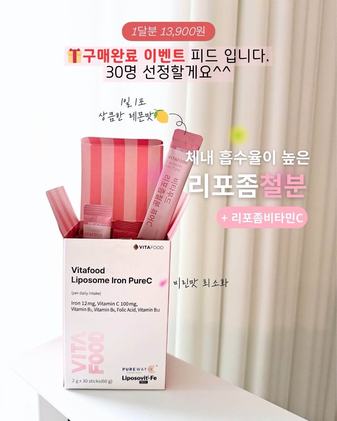 🎁리포좀 철분 구매완료 이벤트 피드입니다! 30명 선정 사전 알림 이벤트 30명 외에 추가 30명 구매완료 이벤트 진행합니다💛 어떤 구성이든 구매후 이 피드에 구매완료 댓글 남기시면 참여 완료😊 📍공구 일정📍 4/23 오전 10시 오픈 📍공구 제품 안내📍 🔺비타푸드 리포좀철분 퓨어C🔺 - 레몬맛 맛있는 파우더 제형 - 1포에 리포좀철분 12mg(비헴철), 리포좀비타민C 100mg, 활성엽산 120mcg(콰트레폴릭) - 사르르 녹는 제형이라 아이부터 성인까지 모두 맛있게 섭취 가능해요 - Liposovit-Fe 리포좀 원료로 철분 특유의 비린맛을 최소화 하고 체내 전달력과 흡수율을 높였습니다. - 제가 정말 열심히 준비했습니다. 열심히 준비한 내용들 상세페이지에 자세히 적어두었으니 공구 오픈후 꼭 살펴봐주세요^^ ✔️프로필 링크에 미리 공구링크 올려둘게요😊 가격 구성도 상세페이지에서 확인해보셔요❗️ ✔️최대 할인가 기준 1달분 13,900원으로 진행할 예정입니다 ✔️소비기한 : 2028년 3월 29일 까지