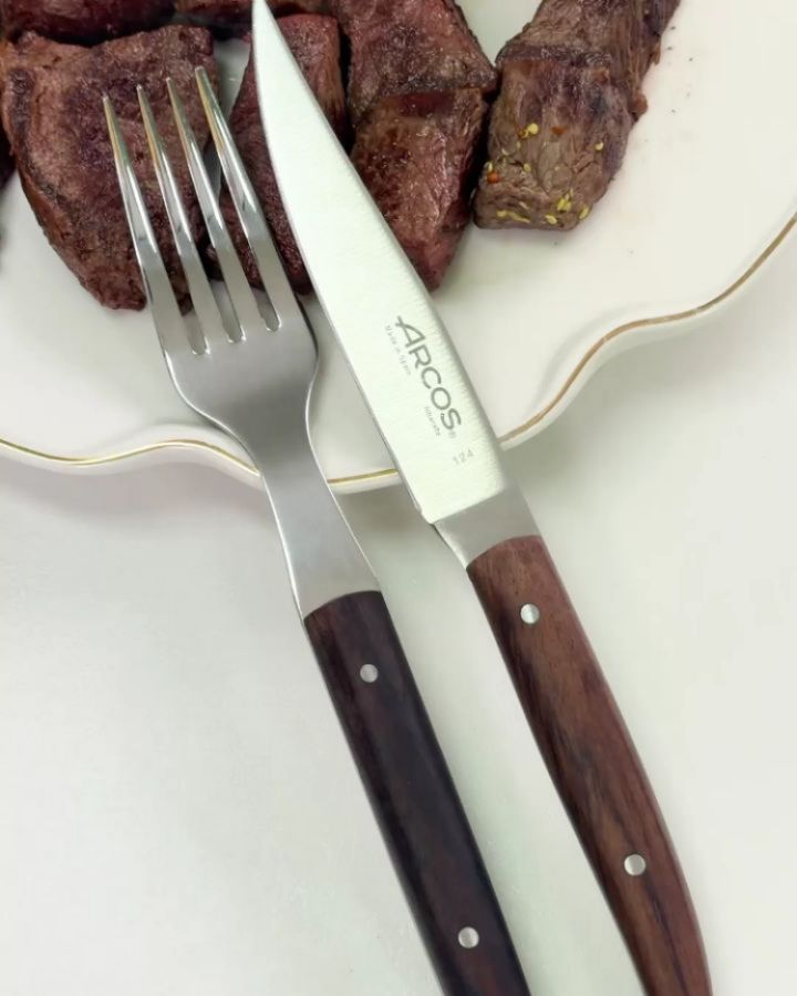 300년 전통 스페인 브랜드 아르코스의 스테이크 나이프. 놀라운 절삭력과 견고한 일체형 디자인으로 스테이크를 쉽게 썰 수 있습니다. 로즈우드 손잡이와 강력한 스테인리스 스틸 날로 안전하고 우수한 내구성을 자랑합니다.