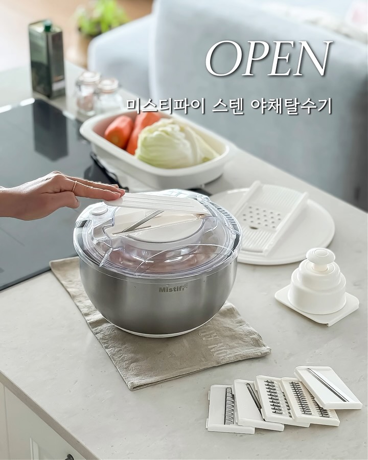 🧡미스티파이 야채 탈수기 스텐 공구예고 믹싱볼, 채칼, 야채탈수기를 하나로 모두 해결할 수 있는 미스티파이 야채탈수기 스텐✨ 야채 썰고, 씻고, 물기 제거까지 한 통에서 끝나는 구조라 요리 준비 시간이 훨씬 간편해져요. 헤드만 교체하면 두 가지 굵기 채썰기부터 편썰기, 물결컷, 강판까지 총 6가지 채칼 기능으로 바로 바뀌어서 재료마다 따로 도구 꺼낼 필요가 없어요. 304 스텐 소재라 내구성이 더 좋아졌고 위생적으로 오래 사용하기에도 훨씬 만족스러워요. 5L 대용량이라 많은 양도 한 번에 손질 가능하고, 야채 손질 후 바로 세척해서 뚜껑 바꿔 눌러주면 탈수까지 이어져 정말 편해요. 스탑 버튼으로 바로 멈출 수 있어 사용감도 훨씬 안정적이고, 샐러드 준비부터 마무리까지 한 번에 끝나니 설거지도 확 줄어요. 도구 여러 개 꺼내던 번거로움 줄여주는 진짜 실용적인 주방템✨ 내일 오픈합니다! 📌공구일정 📢 04월17일-재고 소진시 마감 📍빠른구매 원하시면 아래 흔적 부탁드려요 :)